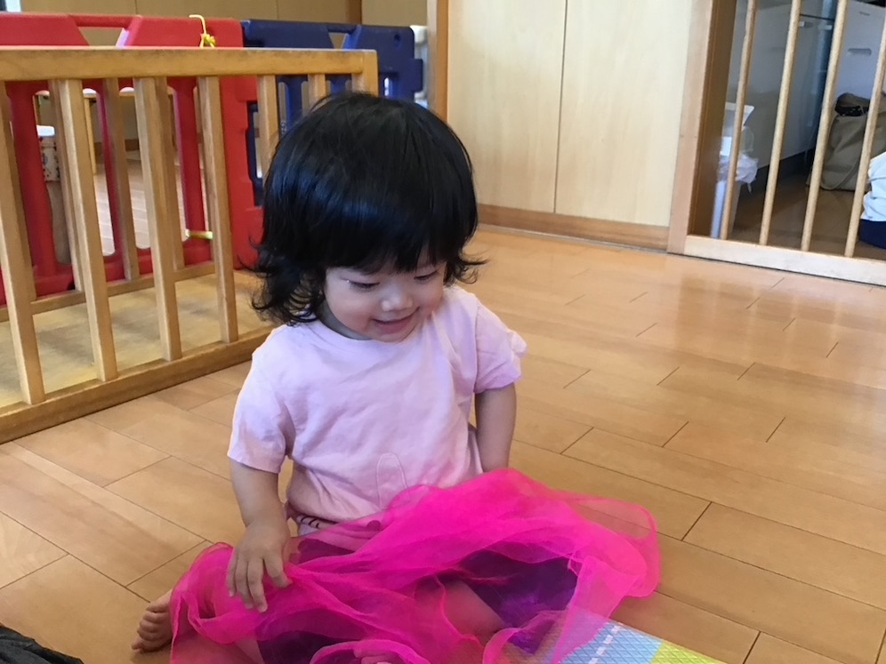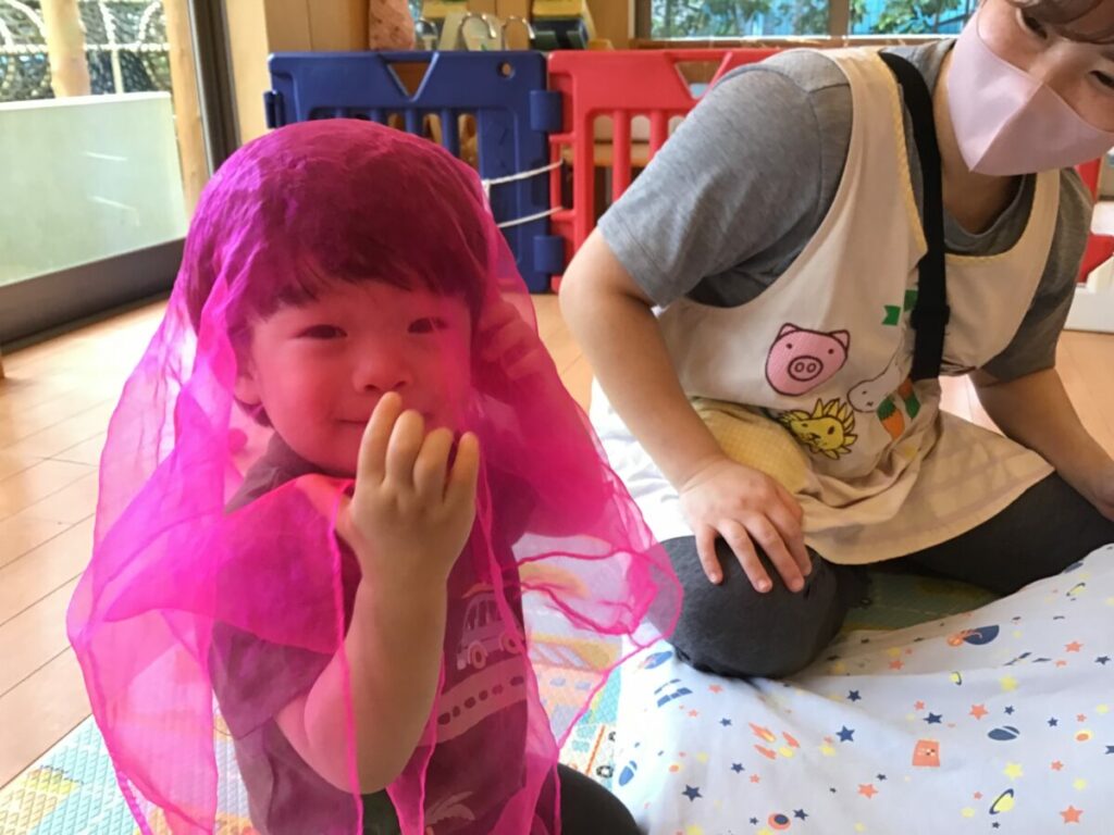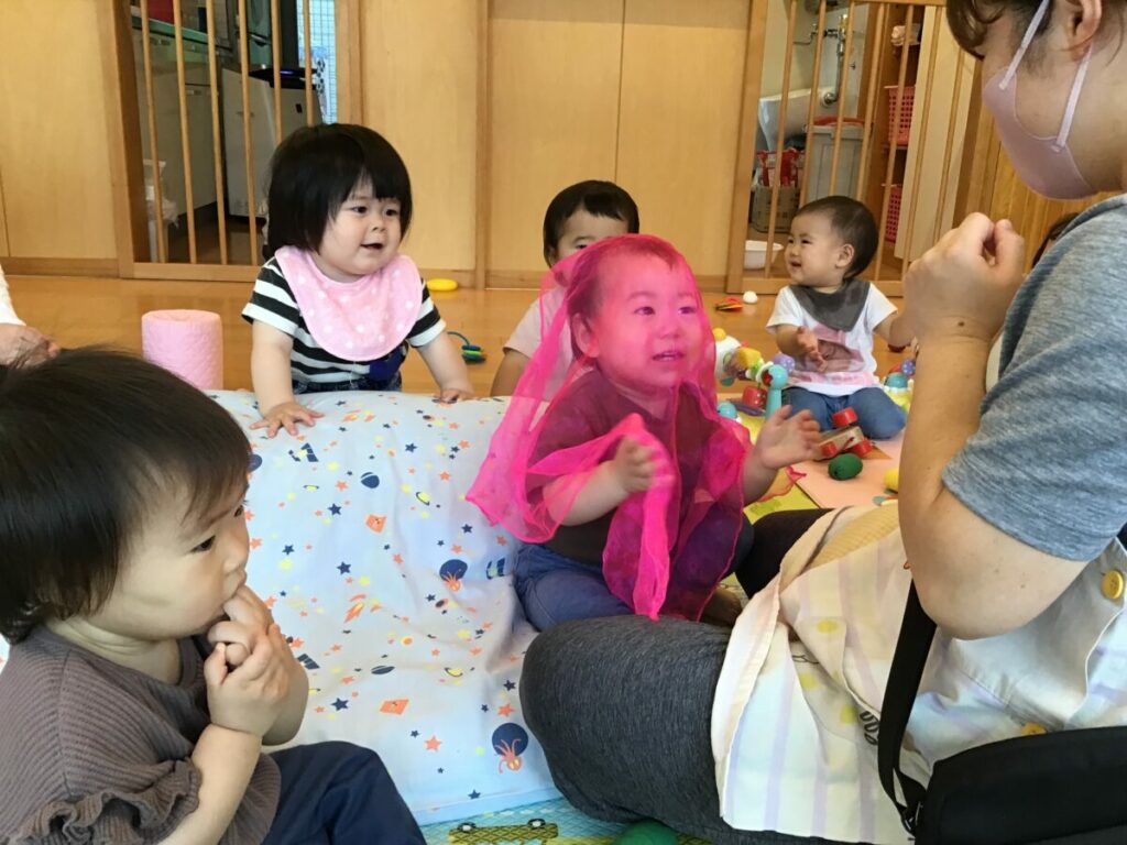 4月から6月までの月のわらべうたとして「ちょちちょちあわわ」「にぎりぱっちり」「ふくすけさん」を行ってきました。他の子への興味が出始めた今だからこそ、大人との関わりだけでなく、子ども同士の関わりも楽しめるように、今後も様々なわらべうたを取り入れていきたいと思います。