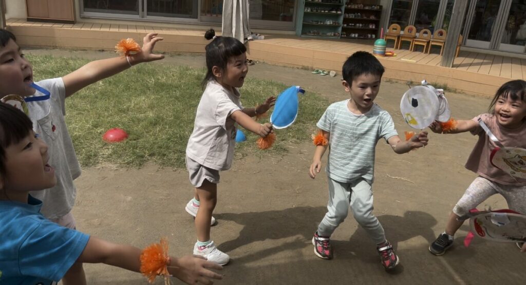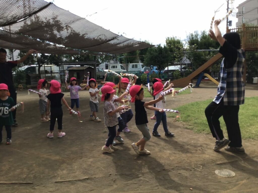 3歳児はかけっことダンス。何度も活動の中に取り入れていくうちに「一緒に走ろう」と友達同士で走ったり、園庭ではプチプチで作った自分だけの棒を使ってみんなで一緒に体を動かして表現したり、踊るのを楽しみました。見ているお客さんが増えるたびに少し緊張している様子はありましたが、お客さんからの反応を自信に変えていっているようにも感じました。