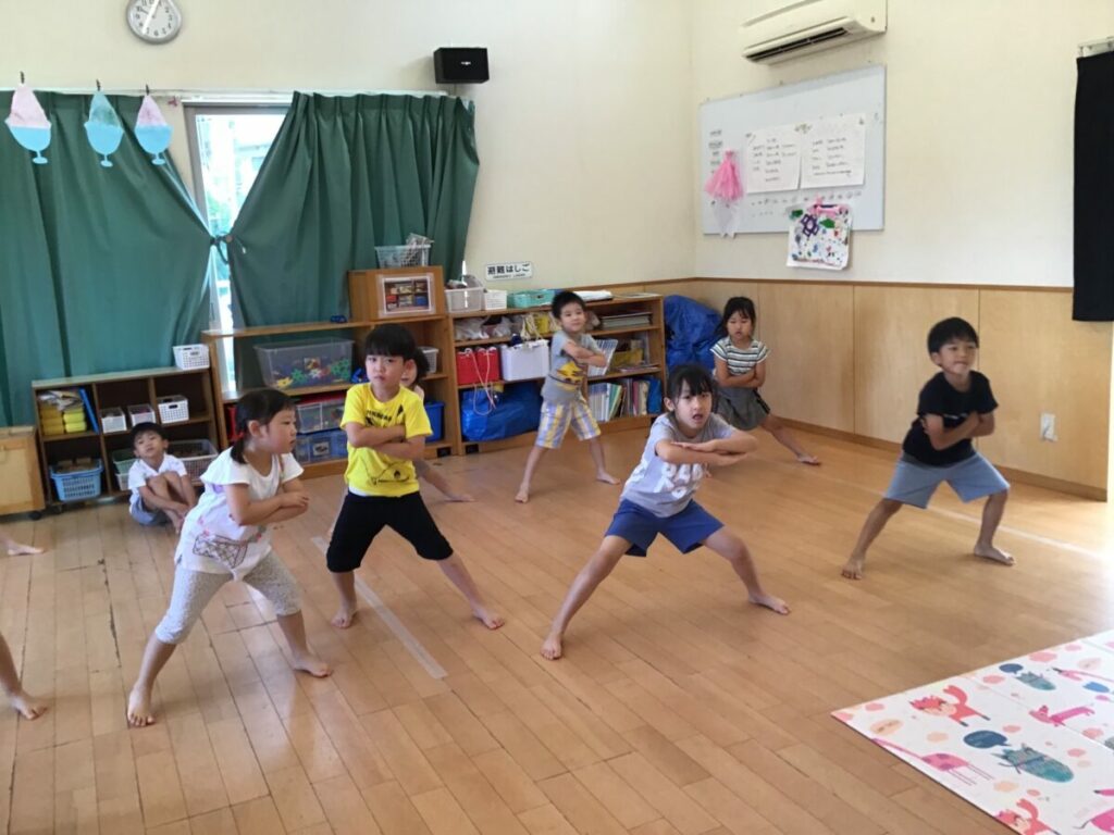 4歳児は「はいシーサー」の元気いっぱいの掛け声とともにダンスの踊って表現を楽しんでいます。