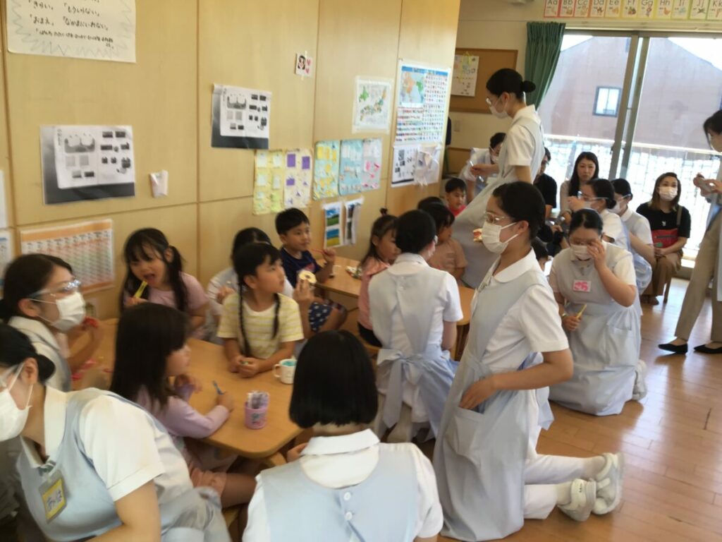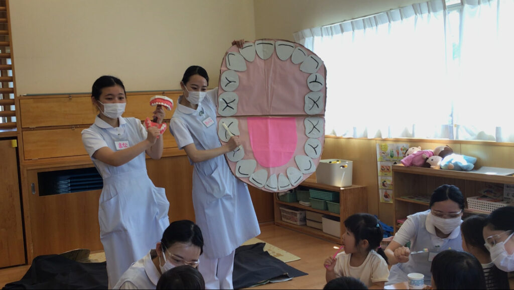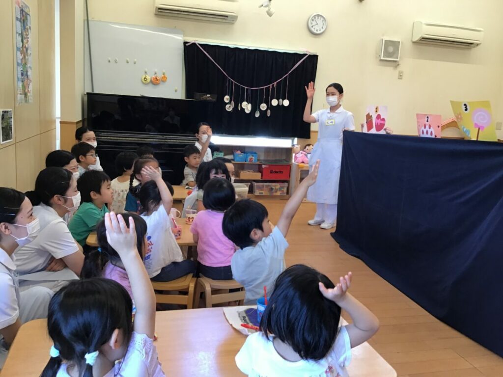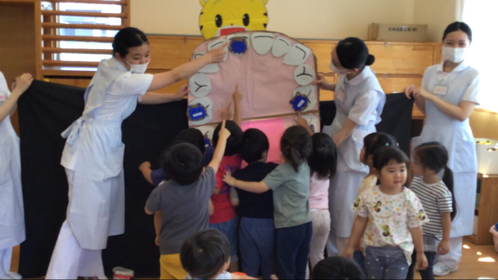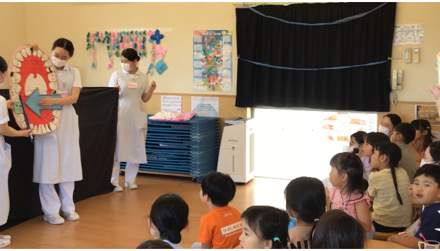 系列の歯科衛生士専門学校の学生さんたちが子どもたちに歯の磨き方や歯磨きの大切さをペープサートで教えてくれました。