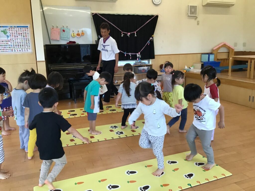 お昼寝から起きたら保育室で体操を行います。5歳児クラスの子どもたちは、2歳児クラス、3歳児クラスにも行き、見本となって体操を教えてくれています。