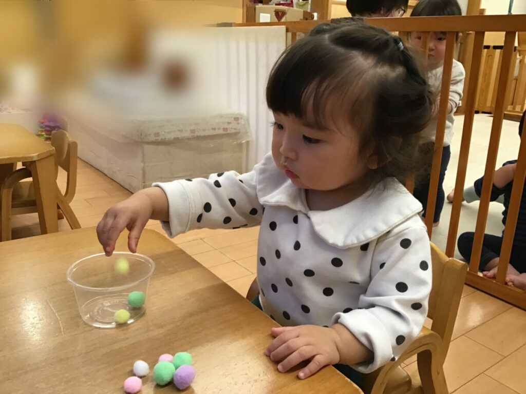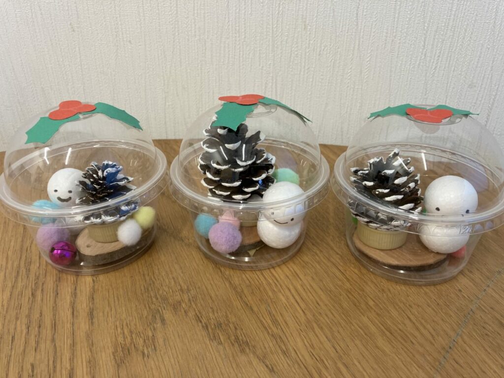 スノードームに入れる、飾りを手先を器用に使って容器に入れることや装飾をすることができました。