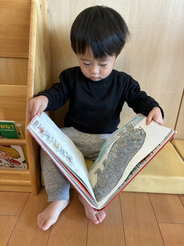 また、普段の保育の中でも毎日絵本を読む時間を設け、子どもたちが絵本に触れ合う時間を作っています。絵本の表紙を見ただけで、絵本の文章をお話ししてくれる姿も見られています。