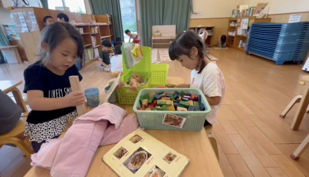 乳児クラスでは、子どもたちは保護者の方や保育者が楽しそうに遊んでいる姿を見て、「やってみたい」と玩具に手を伸ばすそうです。幼児クラスでは、保育環境を設置する大切さを学びました。
