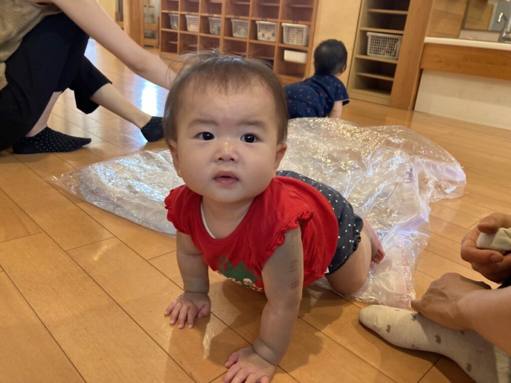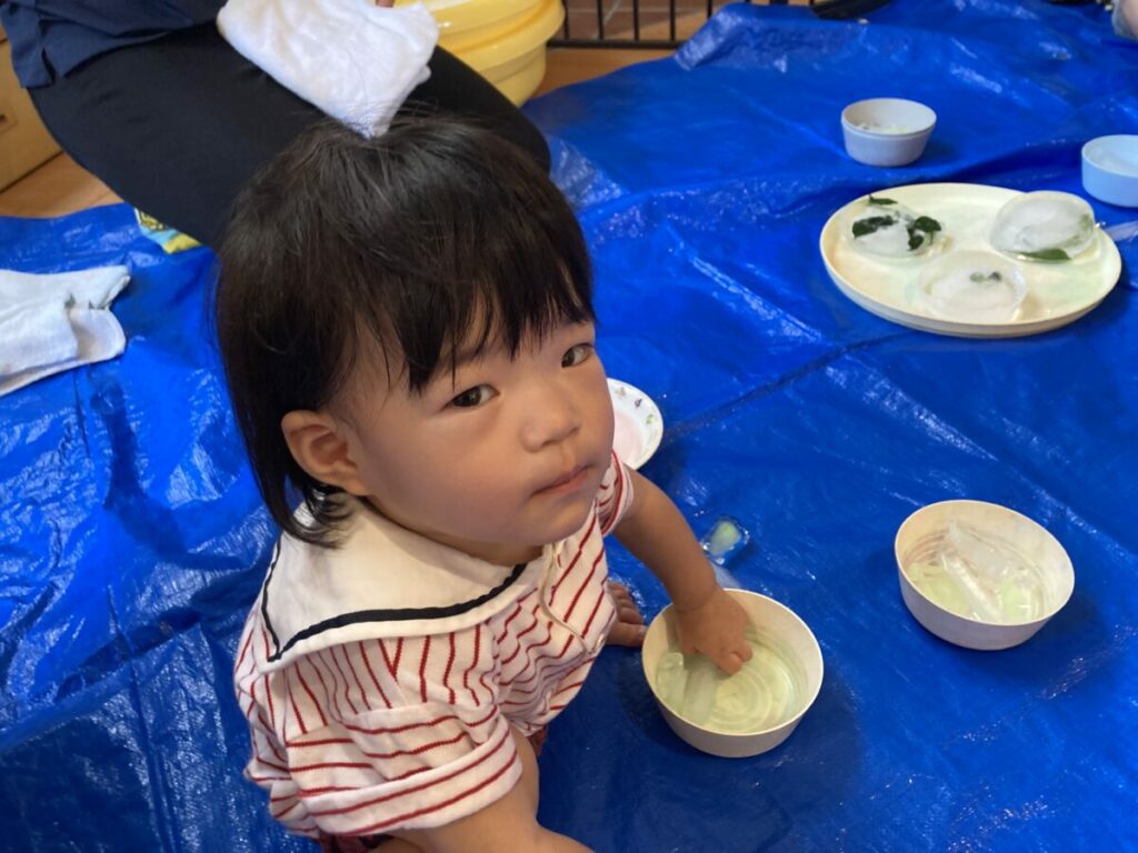 子どもたちは、氷を触ったり、滑る氷を追いかけたりして楽しい時間を過ごしました。ウォーターマットを使って、濡れずに水遊びも楽しみました。