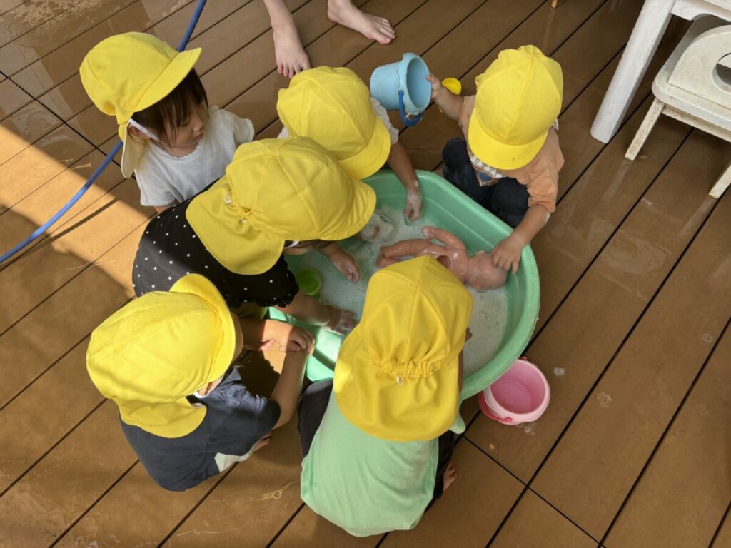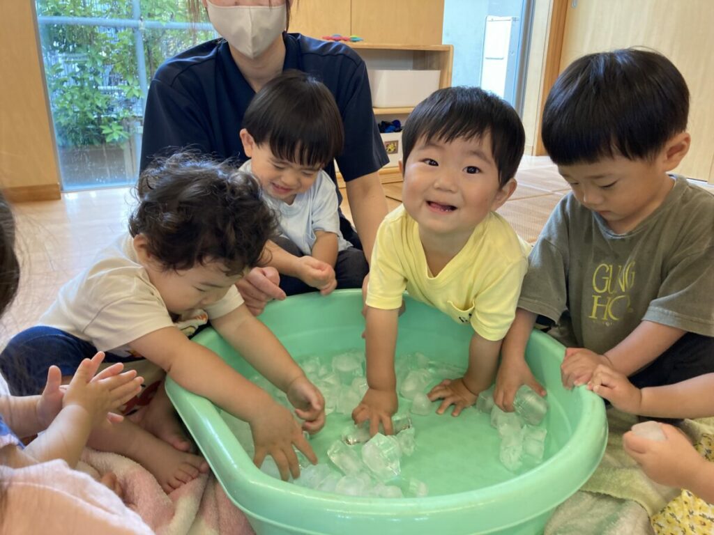 最近、気温が上がり、氷遊びや水遊びをする機会が増えてきました。子どもたちが氷や水、泡などのさまざまな感触に触れながら楽しんでいる姿が見られます。涼しさを感じながら、遊びを通じて夏の暑さを楽しんでいます。