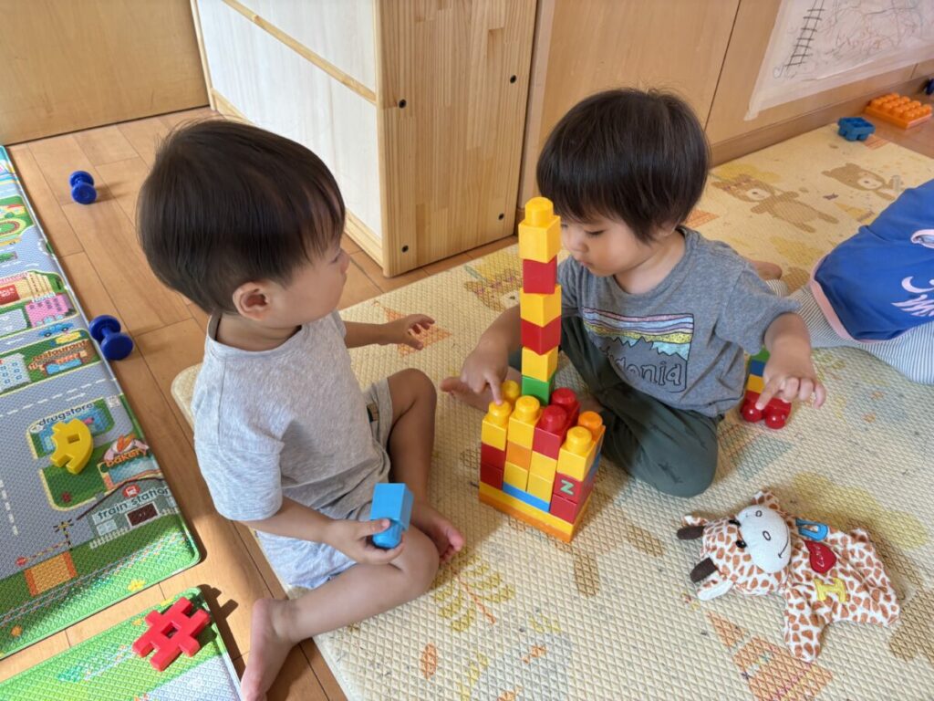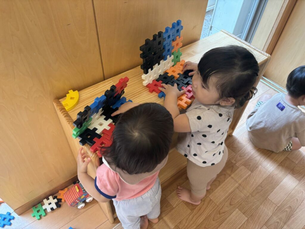最初は新しい環境に慣れず、涙を見せる子どももいましたが、今ではとても楽しそうに、友達や保育者と一緒に遊んでいる姿が見られます。