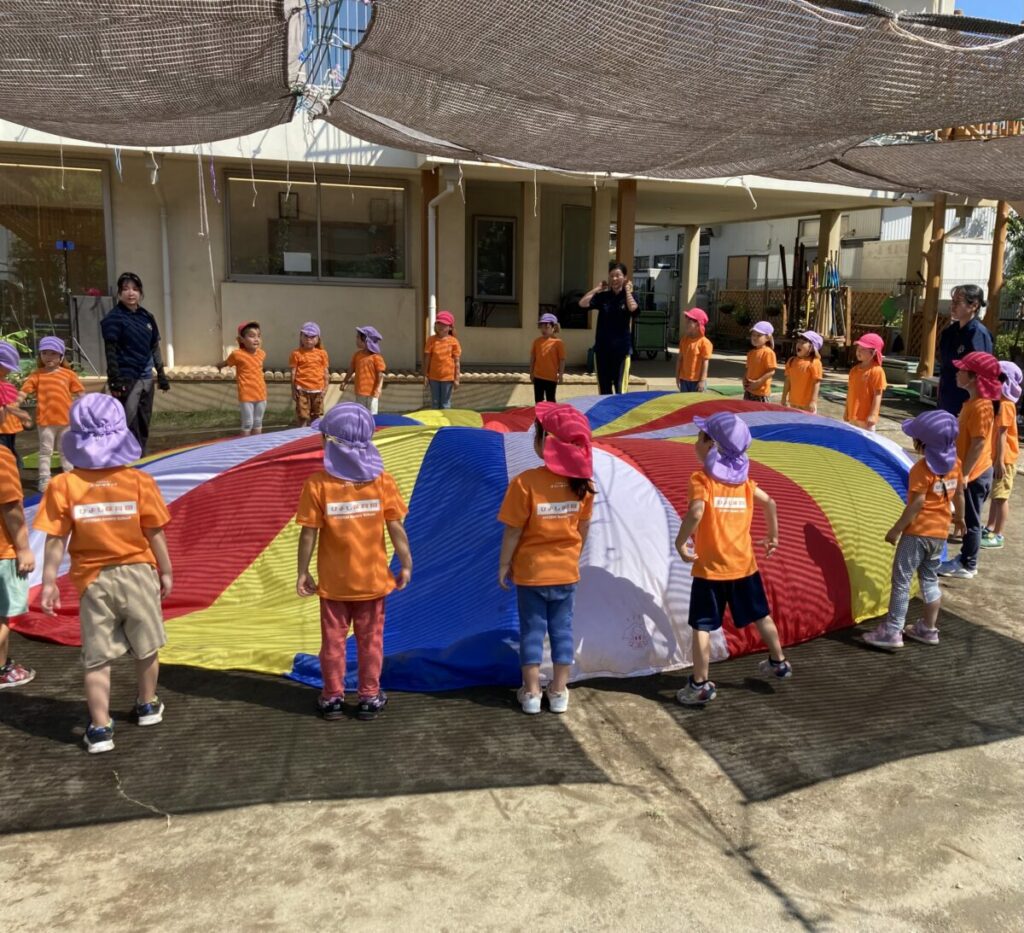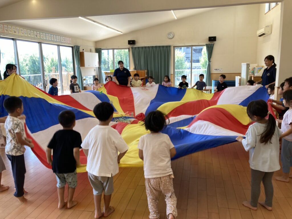 パラバルーンの中心にボールを入れて飛ばす技では、最初はうまく飛ばせなかったものの、息を合わせてタイミングをそろえることで高く飛ぶようになり、「わー」「飛んだ」と歓声を上げ、成功を喜ぶ姿が見られました。みんなで力を合わせる経験が、子どもたちにとって大きな達成感につながっています。