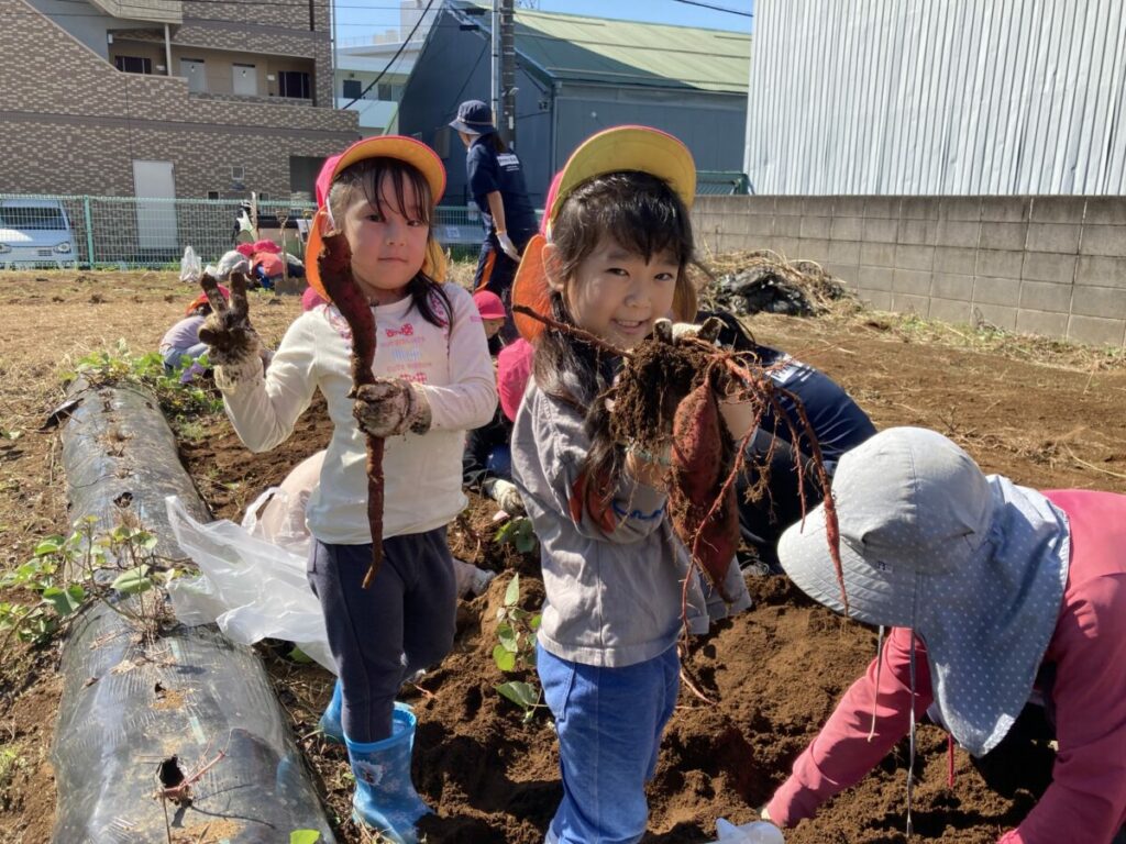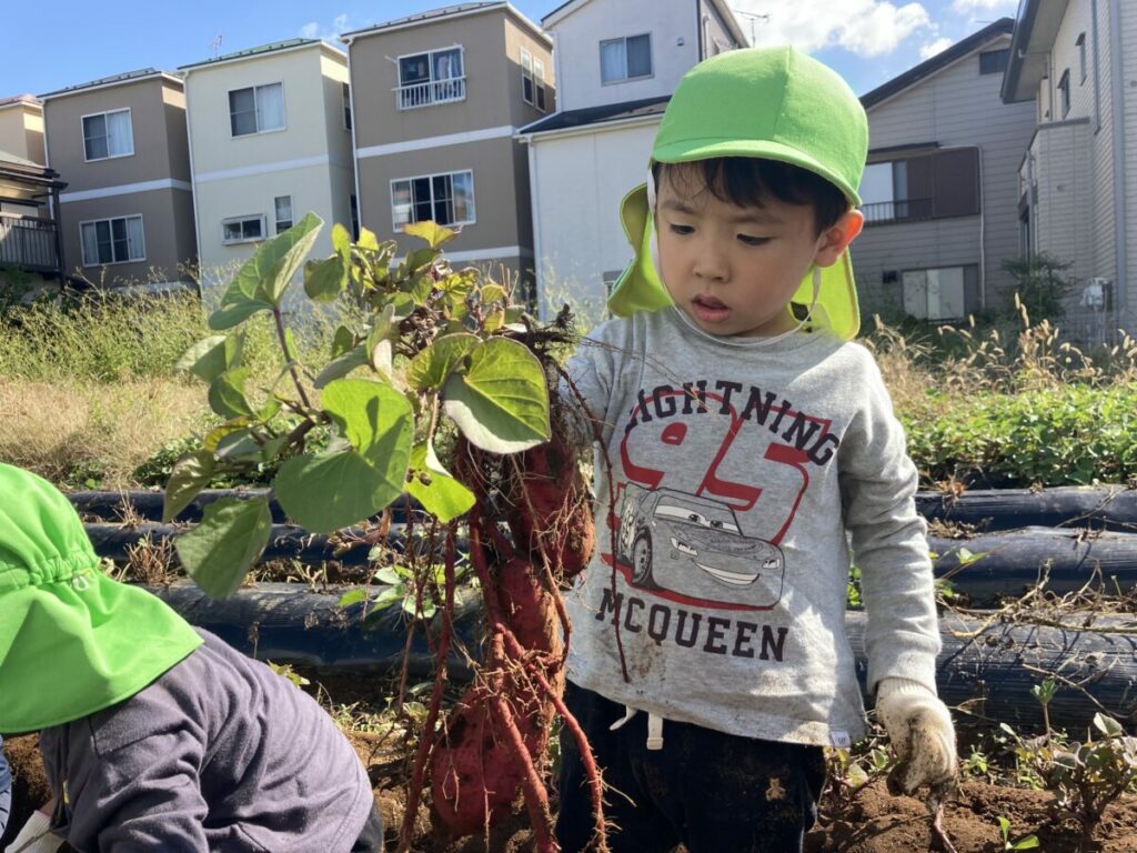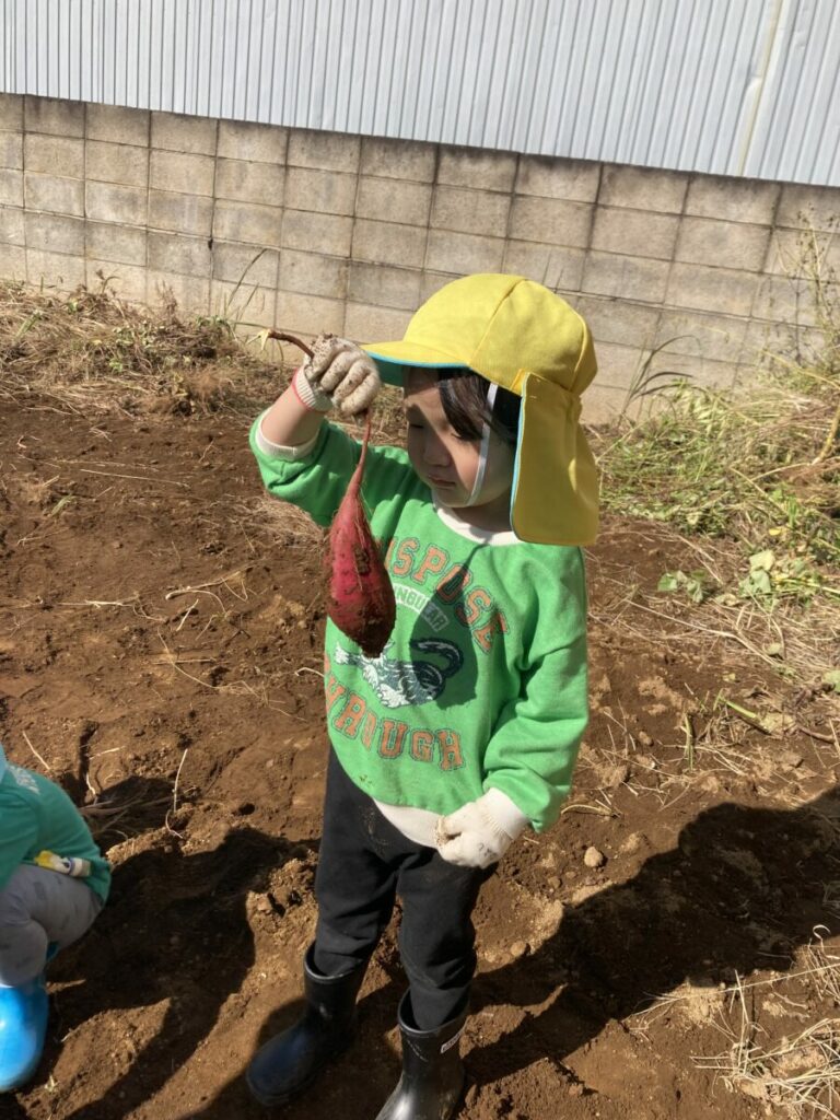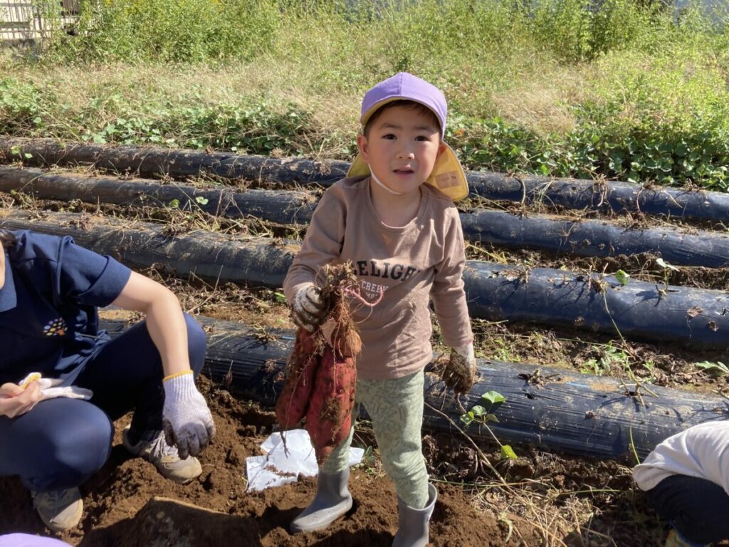 「どこにあるの?」「大きいおいも見つけたい」と、やる気満々で掘り始めました。