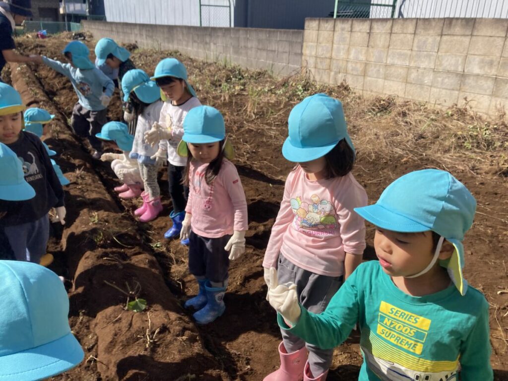 今日は秋の自然に触れる体験として、2・3・4・5歳児のみんなでさつまいも掘りに行ってきました。