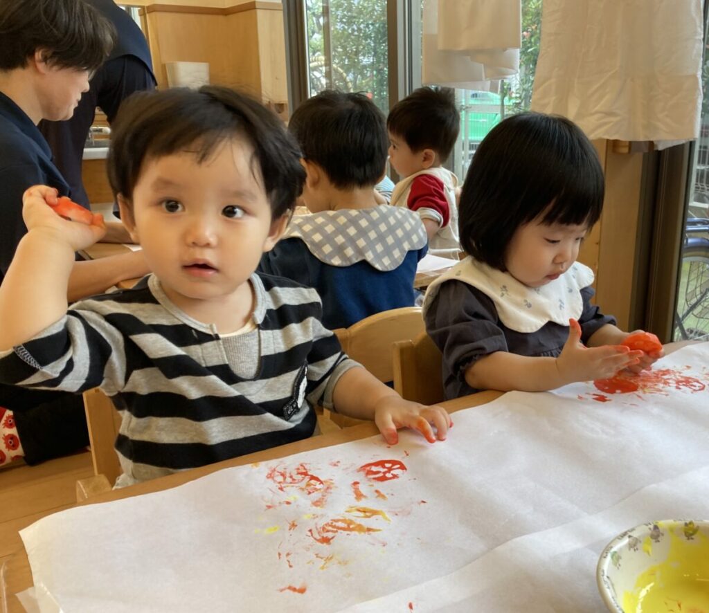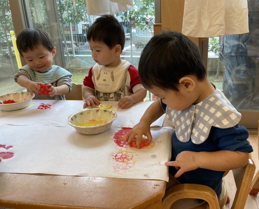 赤・黄色・朱色の絵の具で、紅葉をイメージした素敵な模様ができました。