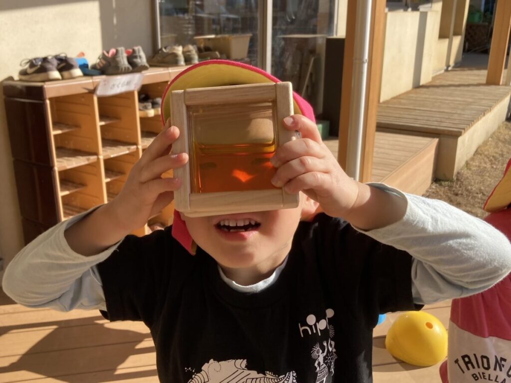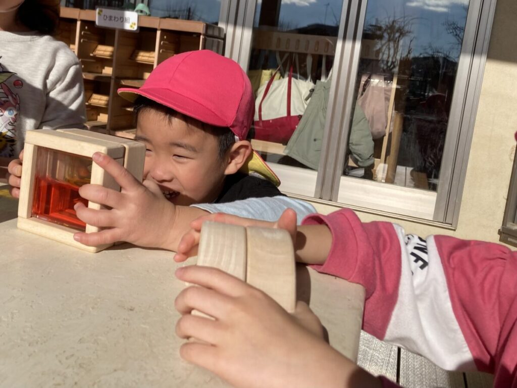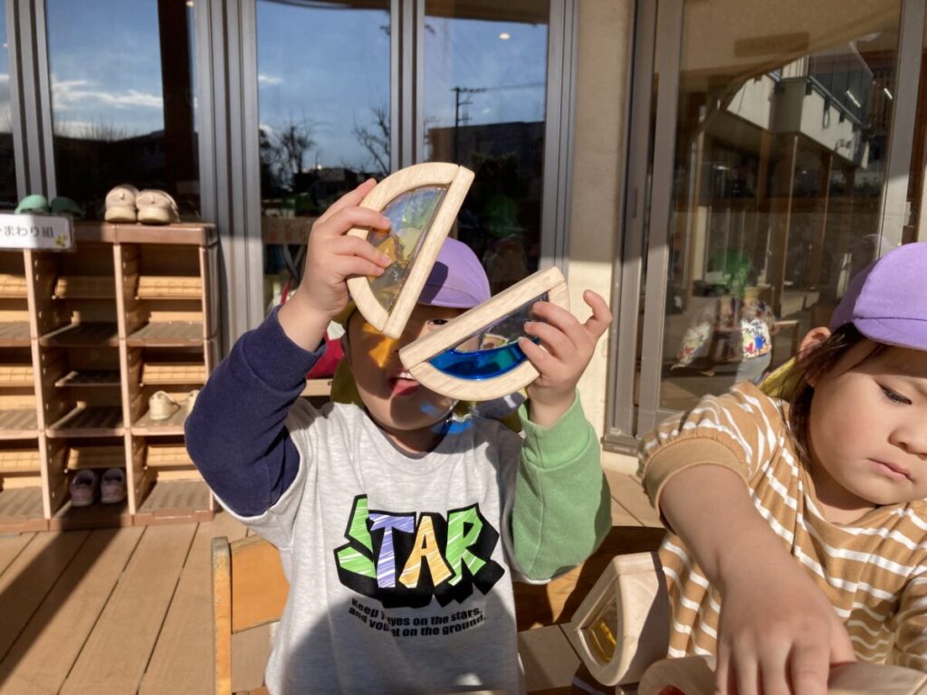 また、ブロックを手に持って光にかざすと、いつも見ている景色が違って見えることにも気づき、「夜になったよ」と想像をふくらませる子もいました。色が重なって変わるだけでなく、床や壁に映る影の色が変わることにも驚き、思わずじっと見つめる姿もありました。