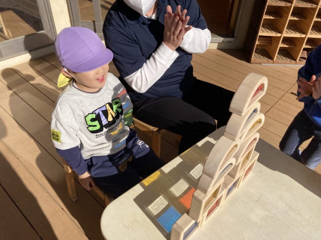 はじめは、ブロックを積み重ねて遊ぶ姿が見られました。円形の積み木をどうしたらうまく重ねられるのか、向きを変えたり、そっと置いてみたりしながら、何度も挑戦していました。うまくいった時の嬉しそうな表情がとても印象的でした。