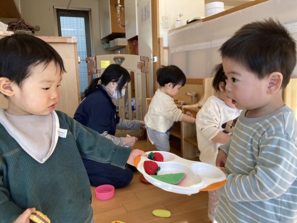 おままごと遊びの中で、苺をお皿にたくさん入れて楽しむ姿が見られました。