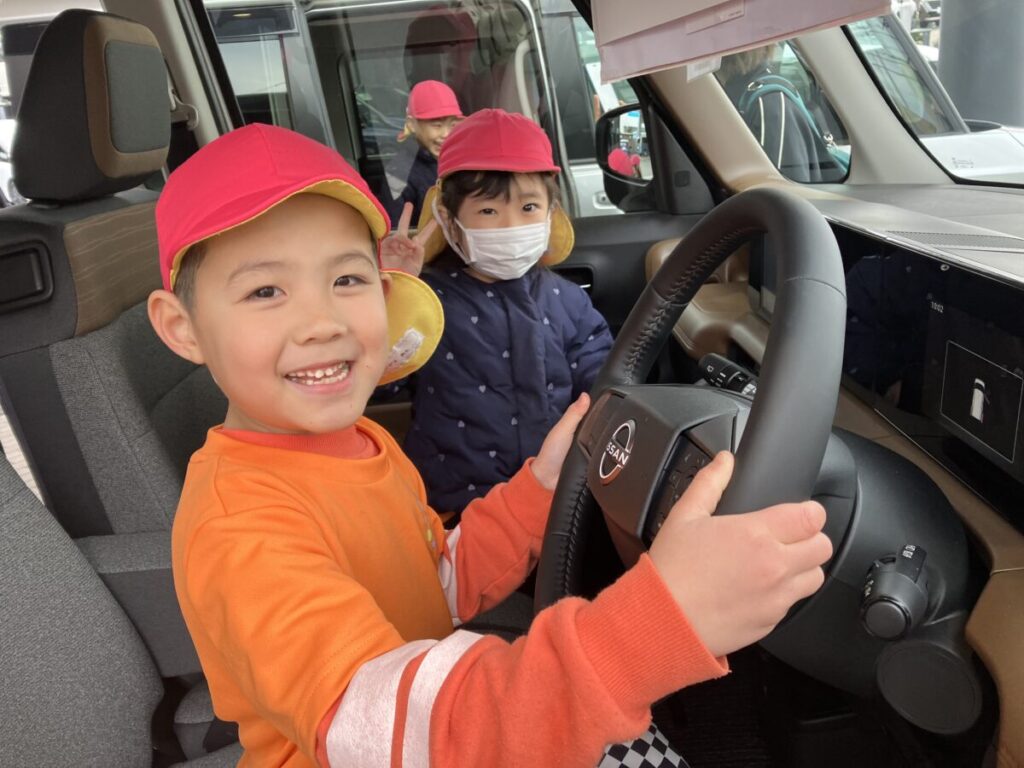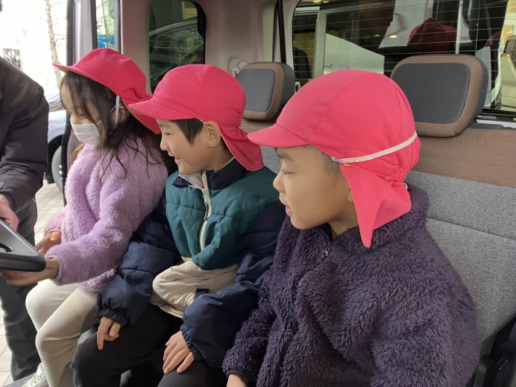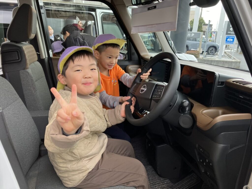 その後、セレナやルークスの車内に乗せていただきました。後部座席に友達と並んで座りながら広さや座り心地を感じたり、普段はなかなか座ることのない運転席に座らせていただいたりと、子どもたちは貴重な体験をさせていただきました。運転席からの目線の高さに気付き、「よく見えるね」とつぶやく姿もあり、それぞれに新たな発見があったようです。