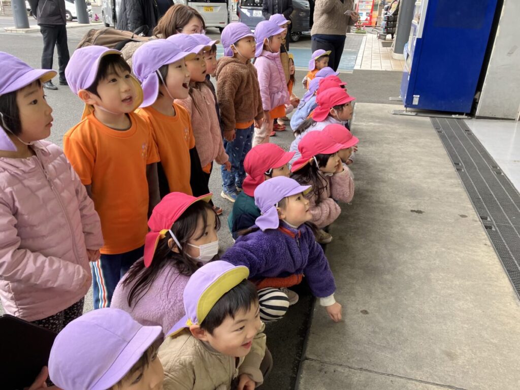 また、整備工場も見学させていただきました。車が機械で持ち上げられている様子を見て、「初めて車の下を見た」と驚いたり、「タイヤはこうやってついているんだね」と気付いたことを友達に伝え合ったりする姿が見られました。実際の作業の様子を間近で見ることで、子どもたちの興味はさらに広がっていました。