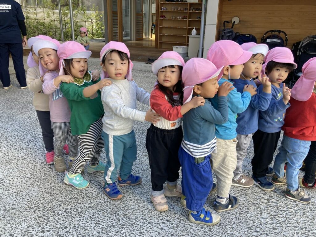 ちゅうりっぷ組では進級に向けて、手を繋いで歩く練習をしています。