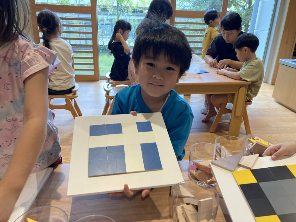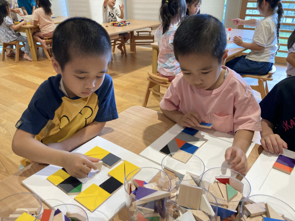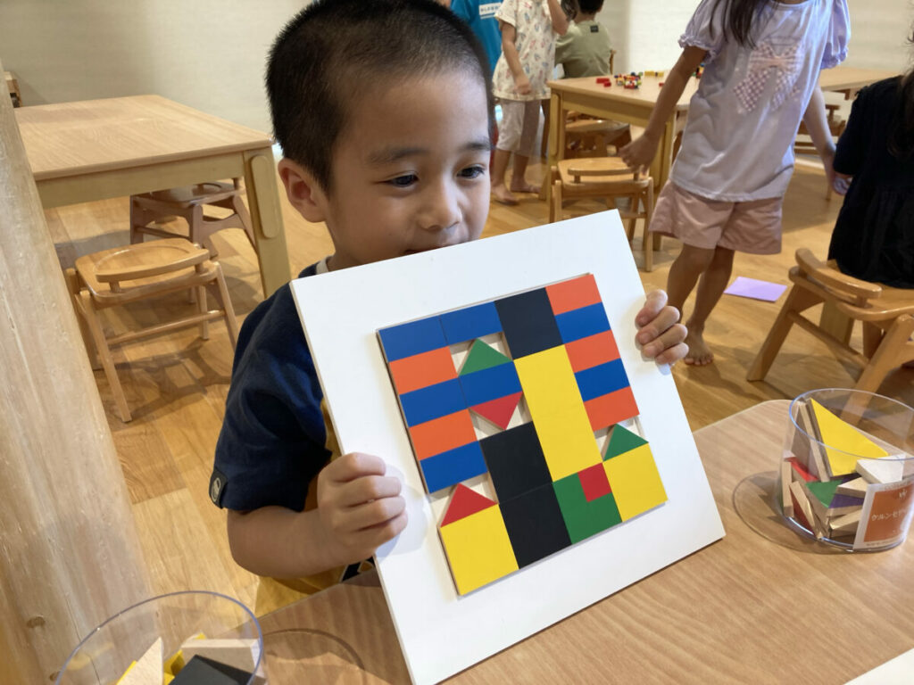 「青を集めよう」「小さい四角が使いたいな」などと自分の好きな色や形を選び、パネルに載せてました。