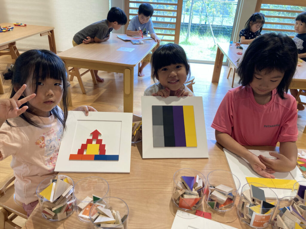 色を揃えて並べてみたり、お城や国旗など具体的なものをイメージしながら並べたりと想像力を豊かに遊んでいました。