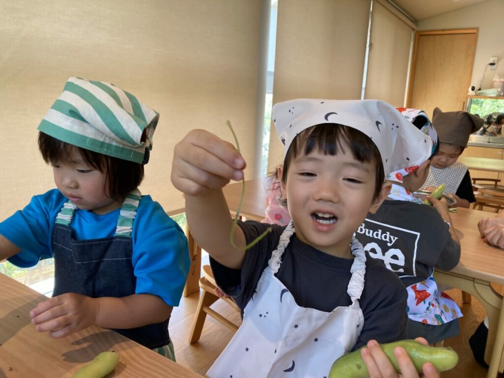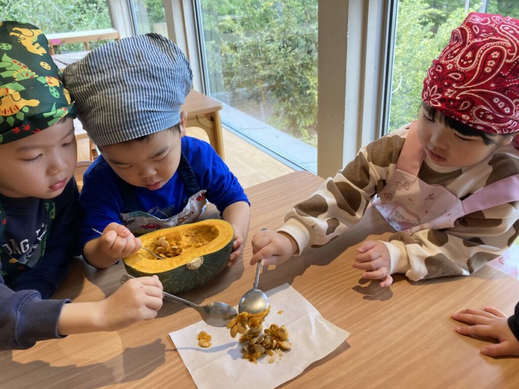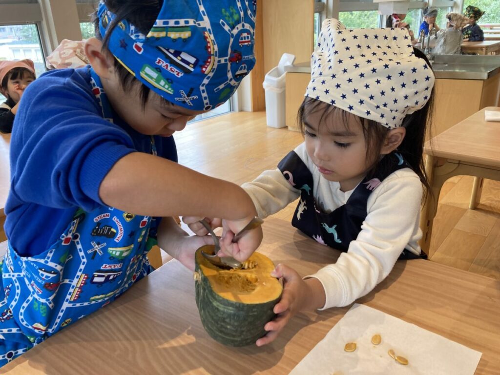 『なんだかかたいね』とスプーンで種をとる感触を味わい、力を必要とすることを知り、また友達と協力することも学びました。