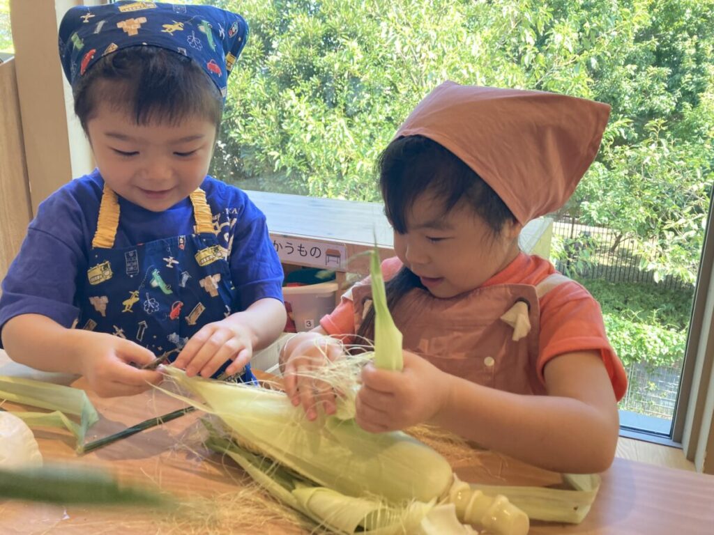 3歳児は旬の食材の皮剥きなどで野菜に触れる食育活動を行っています。