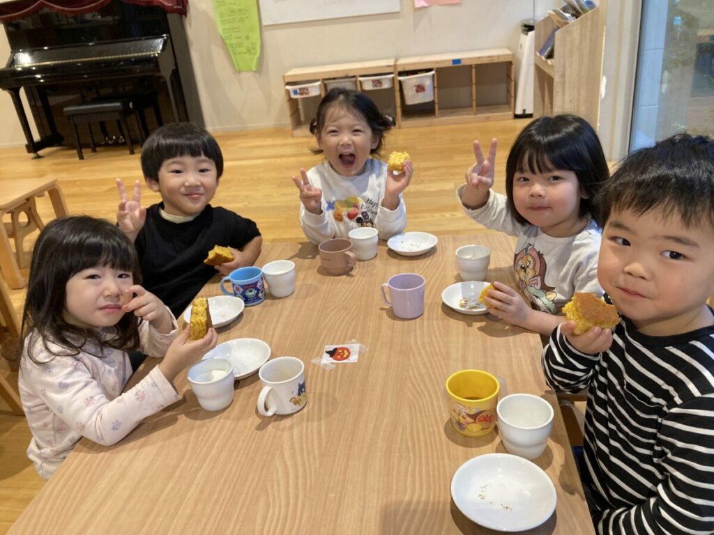 食育のかぼちゃはおやつのパンプキンケーキにしてもらい大喜びで食べていました。