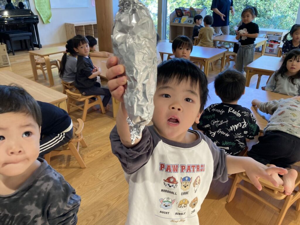 収穫した焼き芋で焼き芋パーティを行いました。前日の夕方はさつまいもの下洗いをし、最後まで夢中で行っていました。当日も子ども達の手でさつまいもを新聞紙・アルミホイルを巻き、「もう一個巻く」と楽しんでいました。
