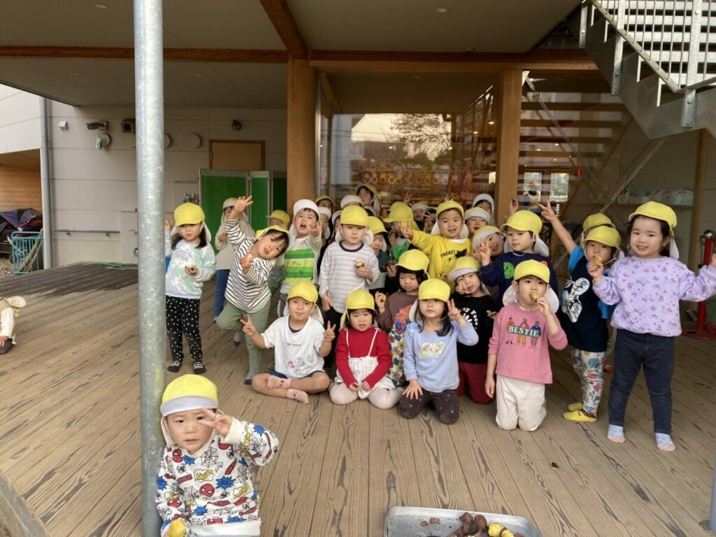 実際に釜を見てどうやって焼き芋が出来上がるのかの話も興味津々で、釜にさつまいもも並べてみました。出来上がった焼き芋はテラスで食べました。自分たちで育て収穫した焼き芋はとても美味しかったです。