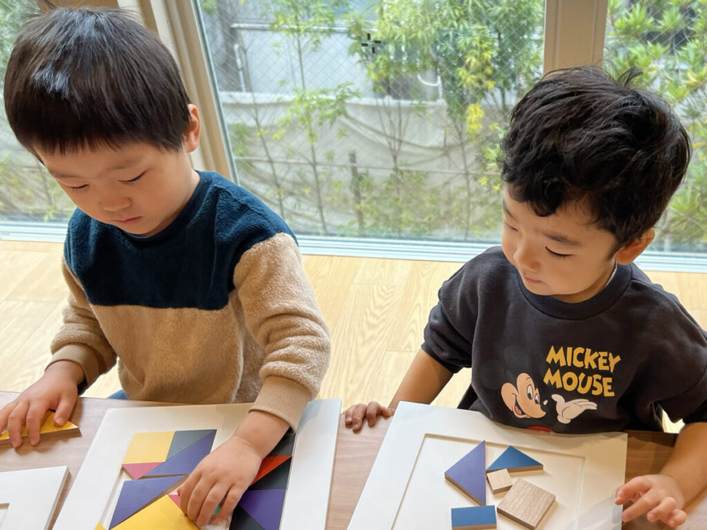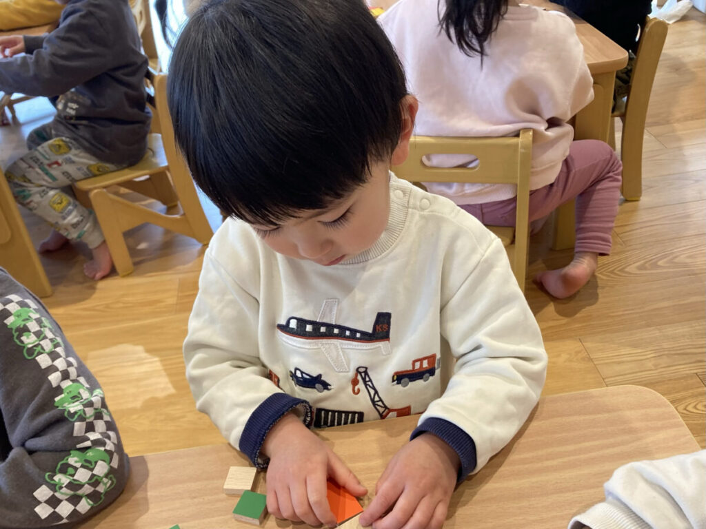 2歳児クラスの子どもたちは、初めてケルンモザイクを使用しました。