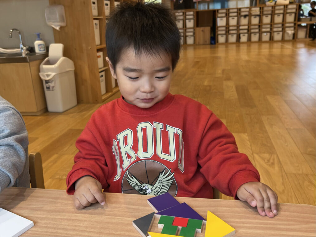 ボタン付け、パズルや色鉛筆を使用した塗り絵などと指先を使用して細かな作業ができるようになってきました。このケルンモザイクを使用して自由な発想と集中して活動を行う力を育みました。