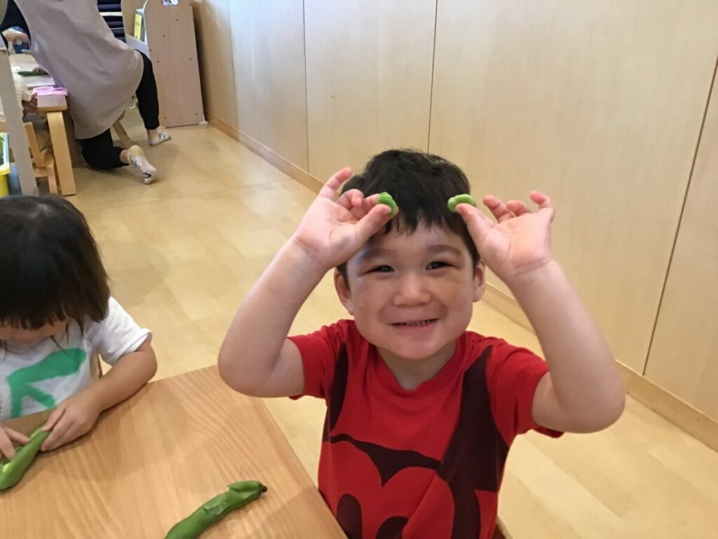 さやはしっかりしていて初めはむくのに苦戦する姿も見られましたが、保育者が少し切れ目を入れてあげると上手に指先を使って剥いていく姿が見られました。