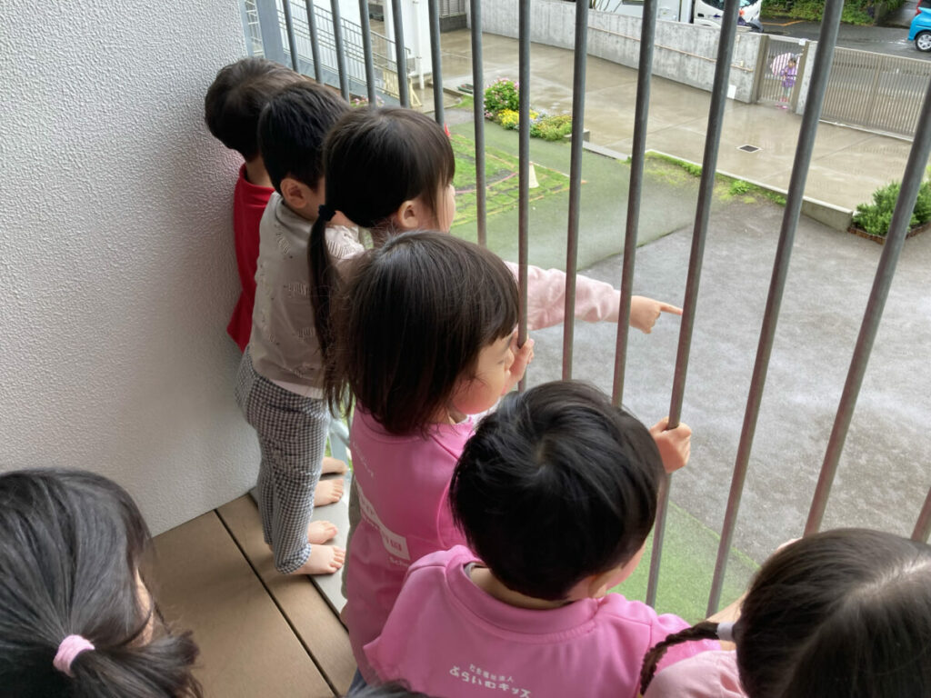 たんぽぽ組では、テラスに出て雨に触れたり、雨の音に耳を傾けたりして雨の観察を行いました。