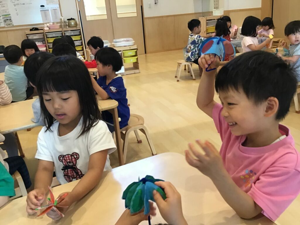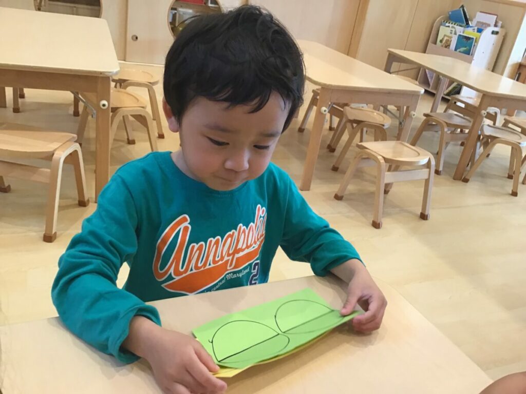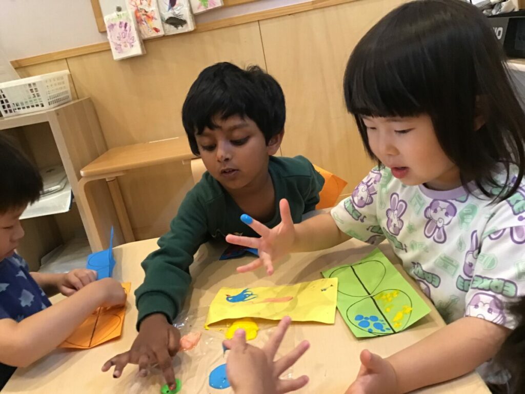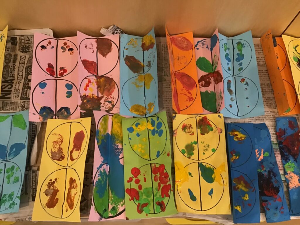 「ちょうちょみたいな形になってる。」「黄色と水色が混ざると、緑になった。」など、色の変化や形の面白さに気づく声がたくさん聞かれ、友達に共有している姿が見られました。