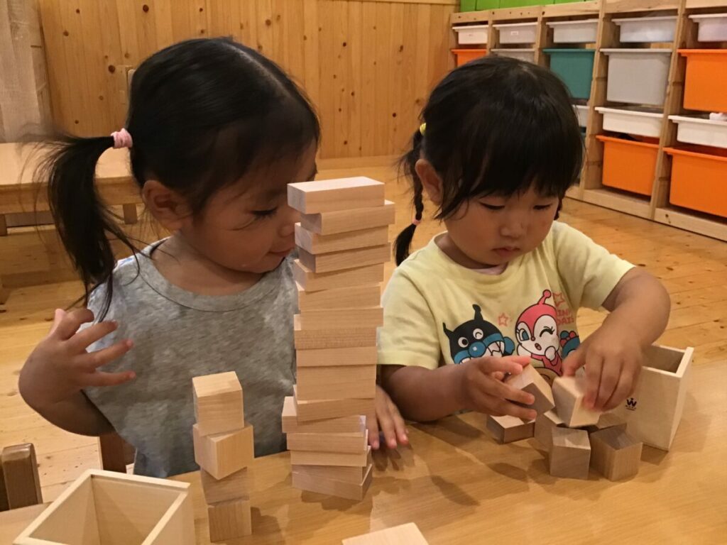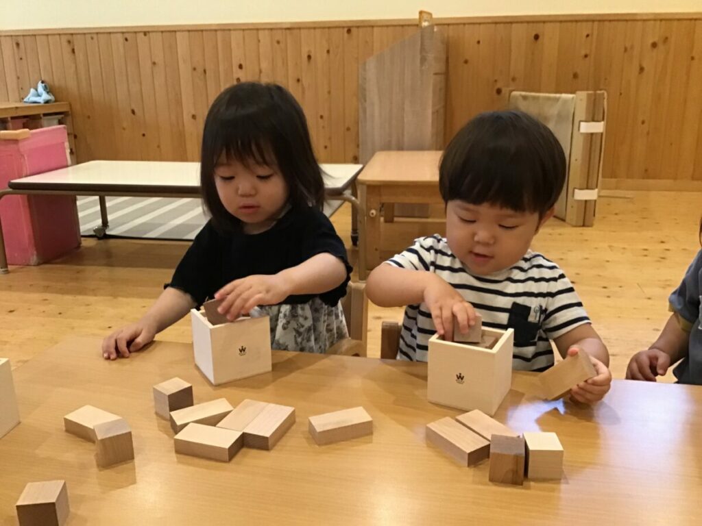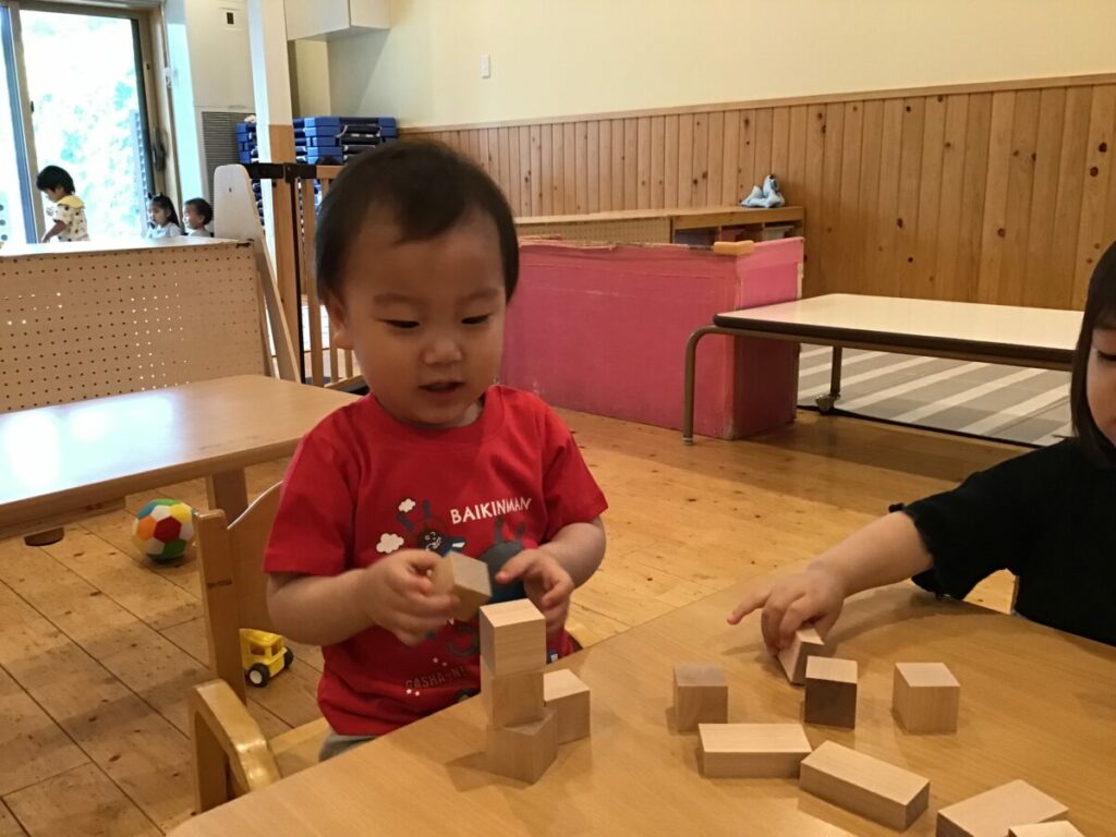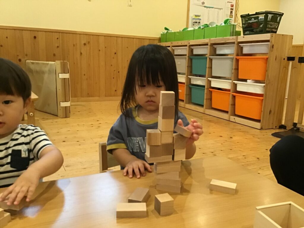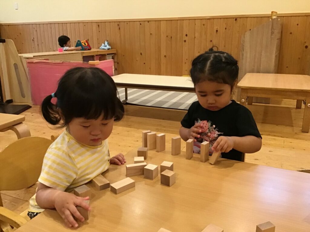 子どもたちは興味津々で積み木を触り、自分なりに積んだり並べたりと楽しんでいました。