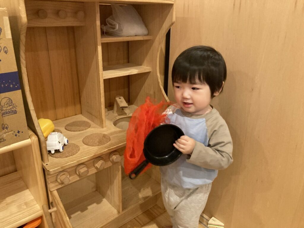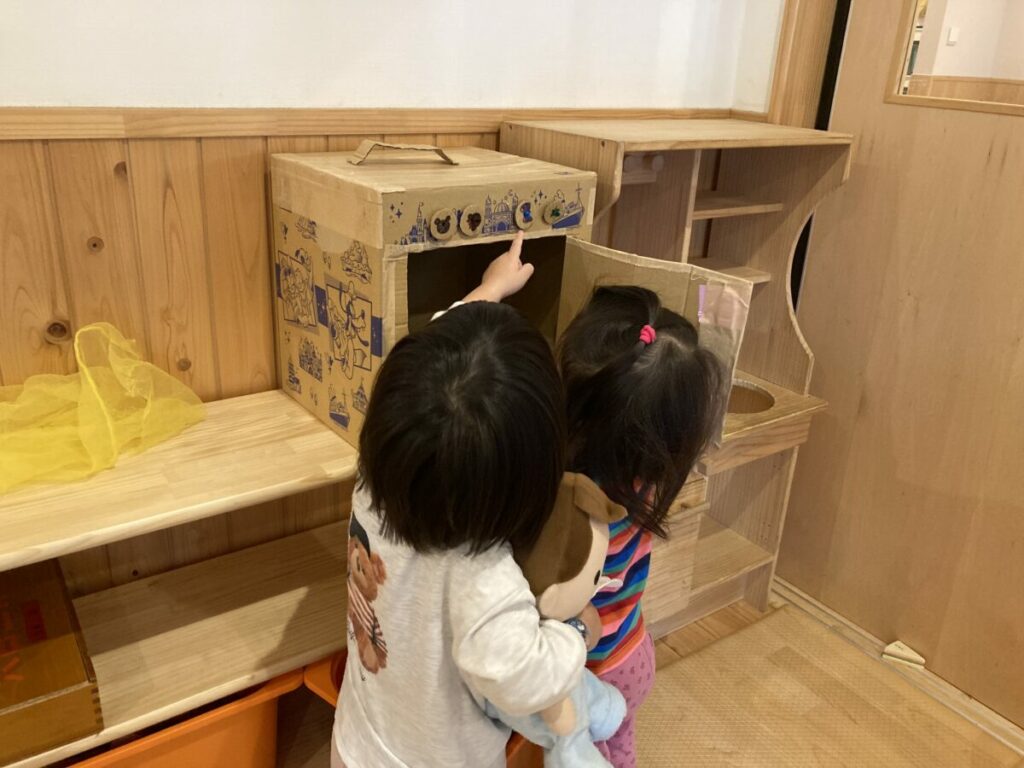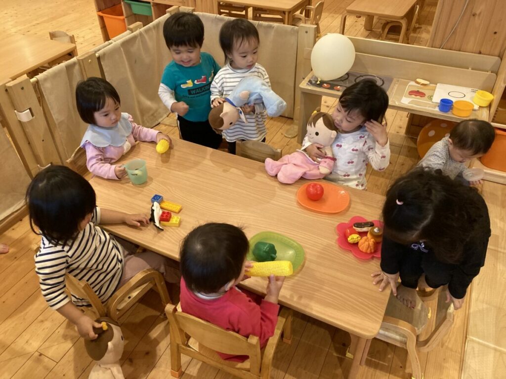 保育室の一角をままごとコーナーにし、机やキッチン、手作りの段ボール電子レンジを配置しました。玩具棚から自分で食材を選び、フライパンに入れてキッチンで調理をする姿や、お皿に盛り付けて友達に「どうぞ」と食べさせてあげる姿がありました。