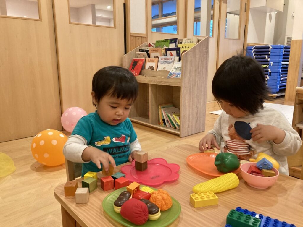 初めはままごとの具材だけでしたが自分たちでカラフルの積み木やオーガンジーを持ってきて、食材に見立てて遊ぶ姿もありました。