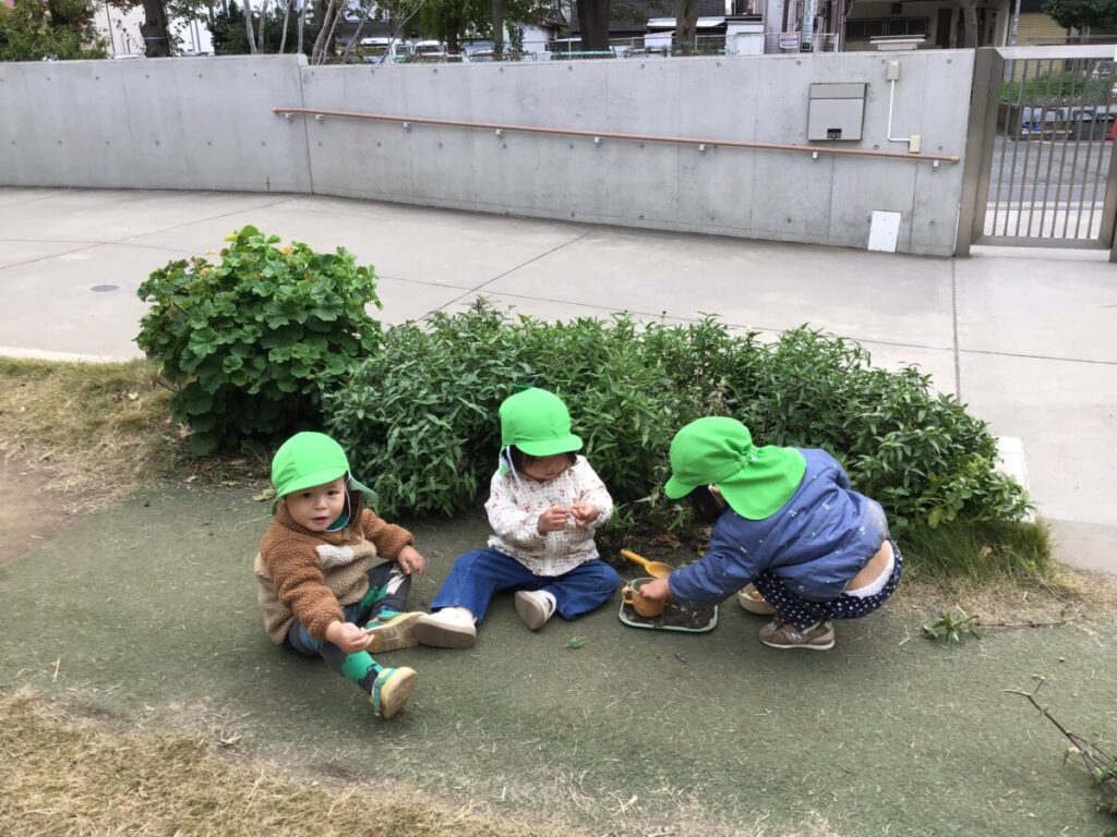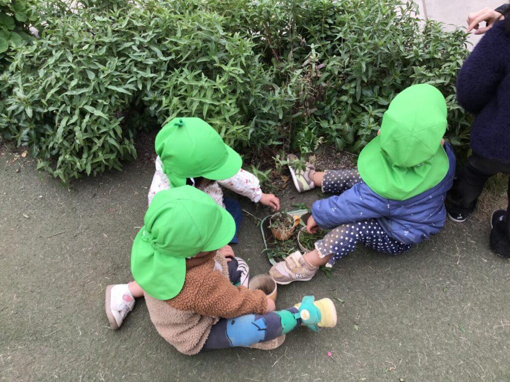 お花は光に当たるととても綺麗で、「綺麗だね」と声をかけると、お花を太陽にかざし、「うわぁ」と感動した表情を見せてくれました。自然物の美しさに触れながらままごと遊びを楽しむことで、自然への興味が高まっていくことを感じました。