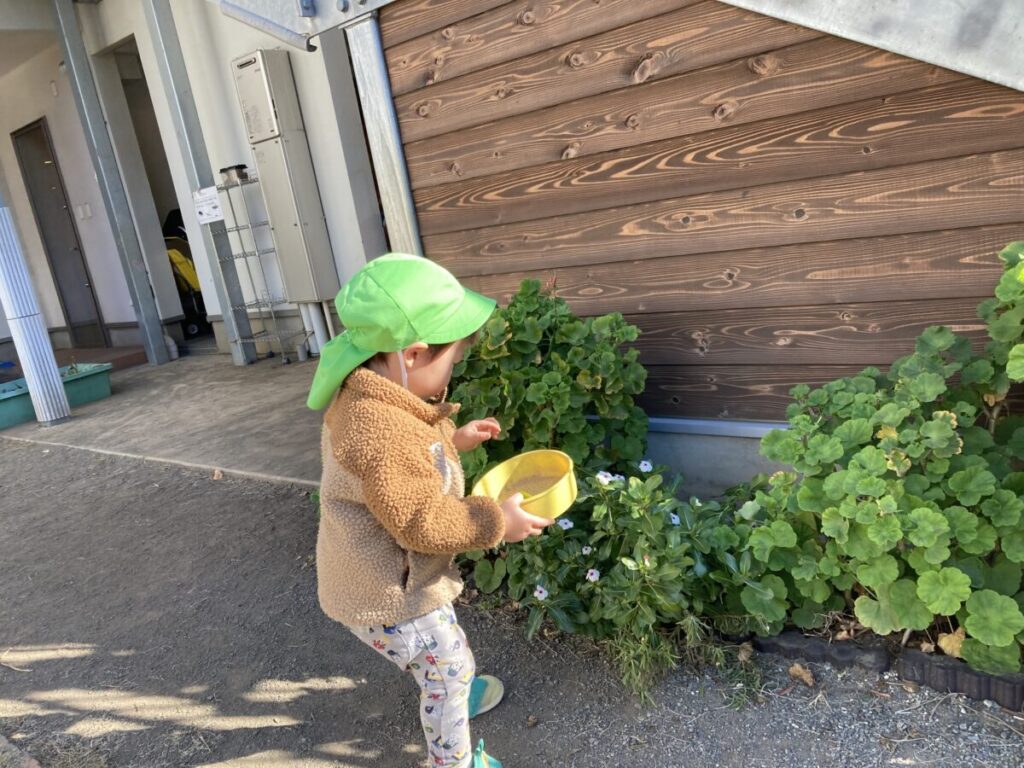 「これご飯作る」と言いながらザルにお花を集め、たくさん集まると満足そうな表情で友達の元へ戻って行きましたよ。