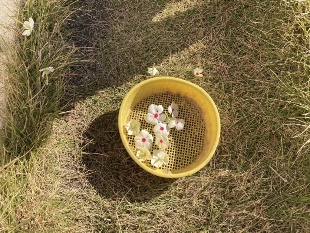 ザルの中には白くて綺麗なお花がたくさん入っていました。