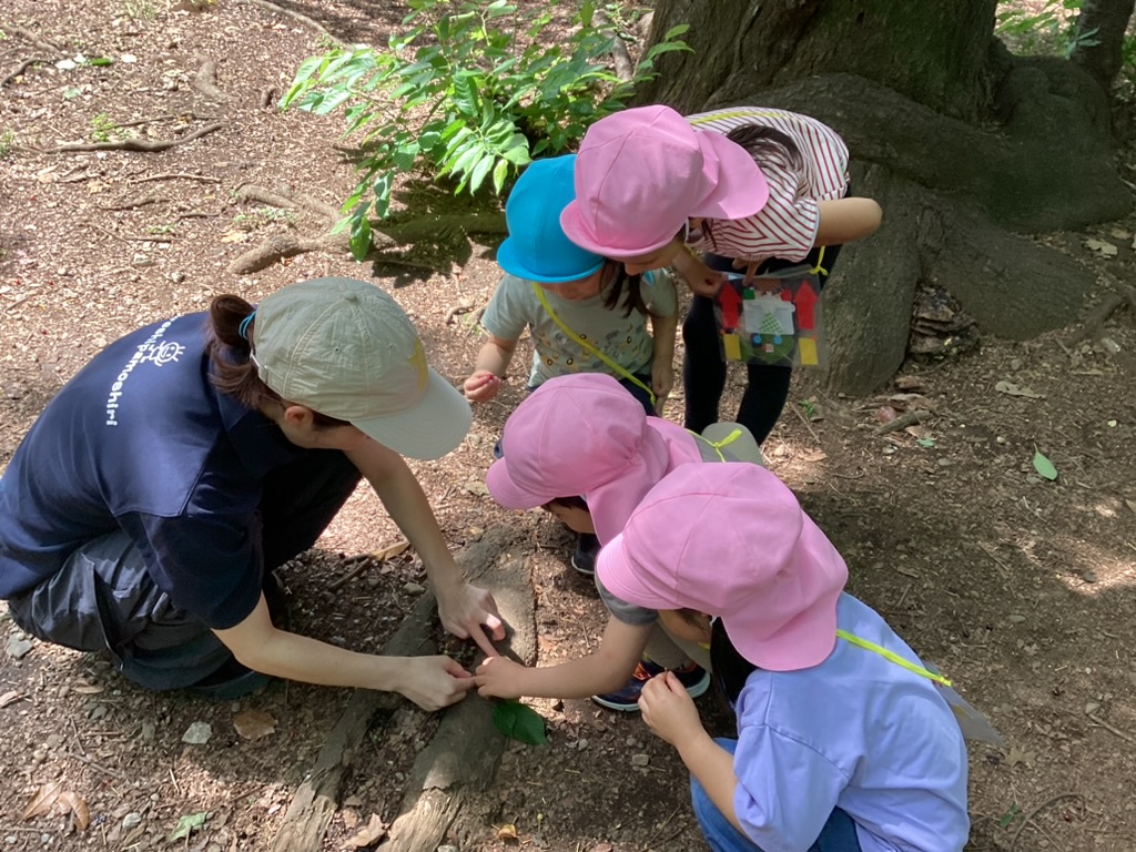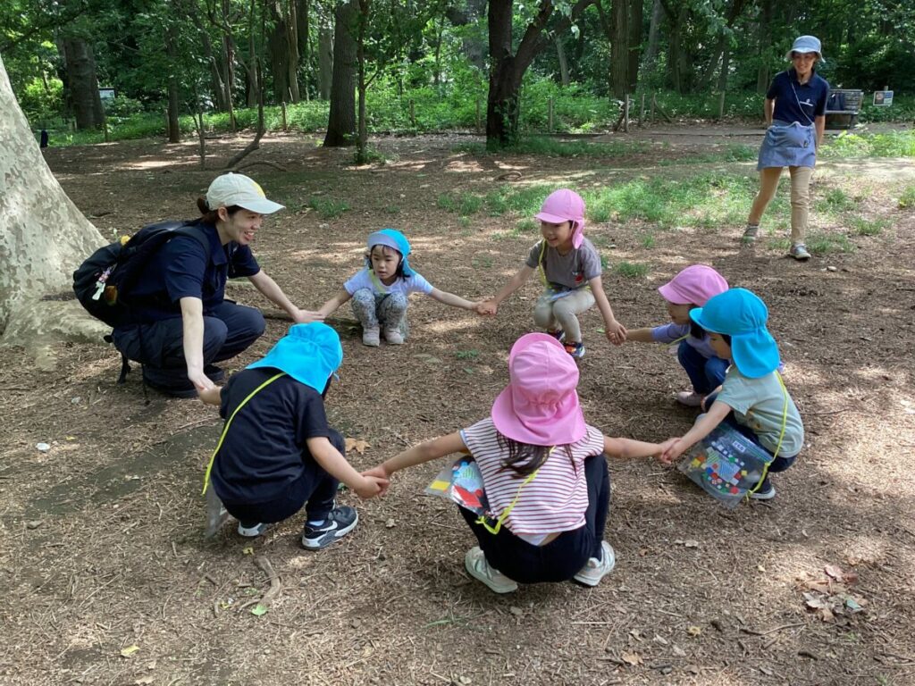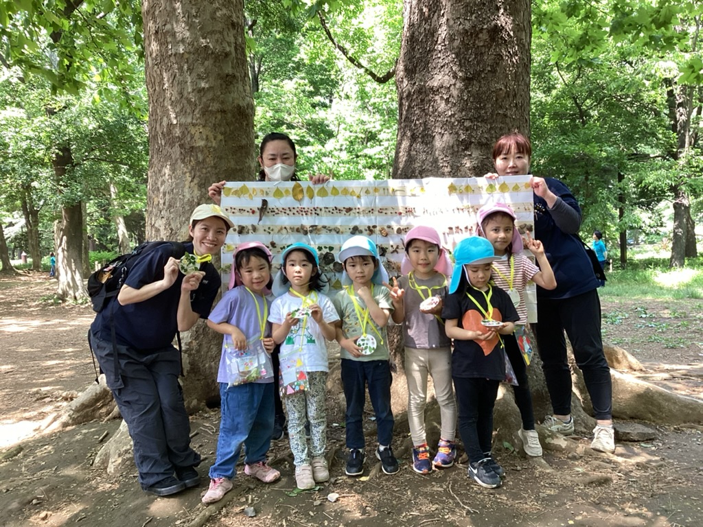 子どもたちは手作りのお散歩バッグを手に、おなじみの林試の森公園へ。たくさんの自然物を見つけては、友達と「見てみて!」と嬉しそうに共有する姿が見られました。慣れ親しんだ場所でも、毎回新しい発見があるのは素晴らしいことです。