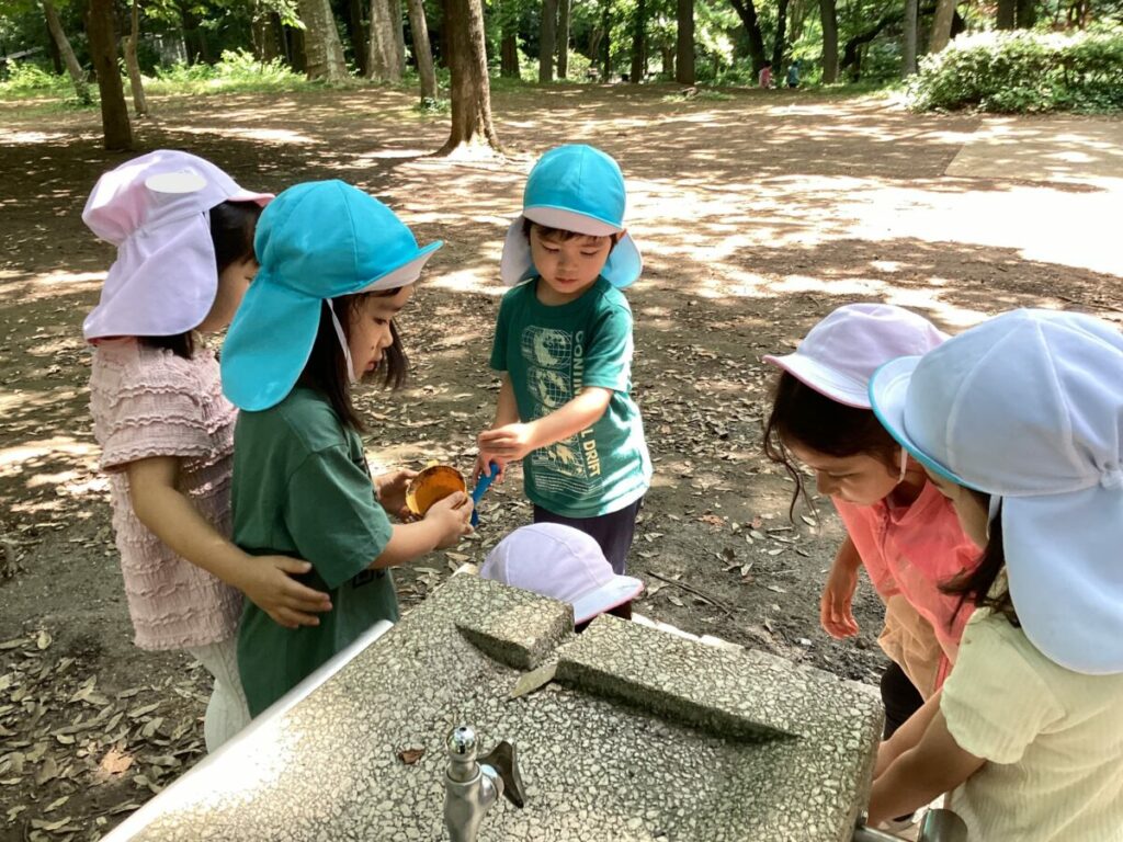 「たくさん水を汲んで流してみようよ」「ダムみたいにたくさん流したい」子どもたちの無限の想像力を具体的な形にするために、みんなで協力しながら水を汲んでいます。