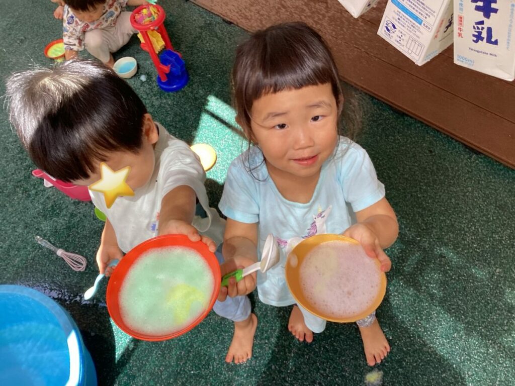 「いちごみたい!」「これはメロン!」など、想像をふくらませながら、泡の感触をじっくり楽しんでいました。