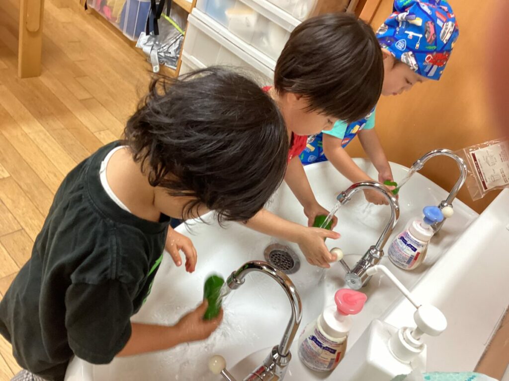 子どもたちは不思議そうに観察しながら、ひとつひとつ丁寧に洗っていました。