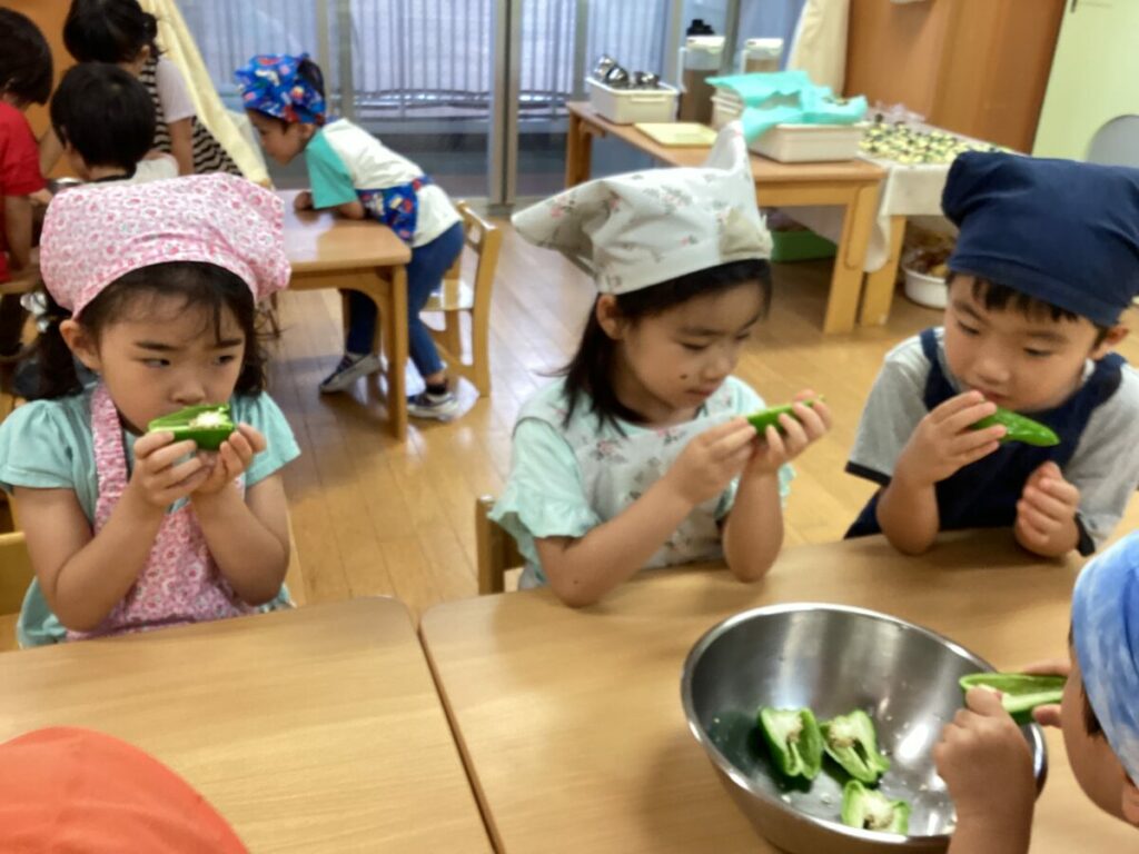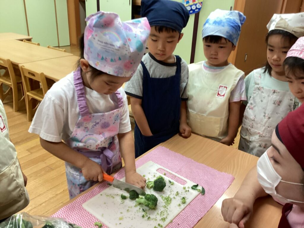 初めて包丁を使う子も多く、少し緊張しながらも、切り終えると「上手に切れた!」と自信に満ちた表情を見せてくれました。