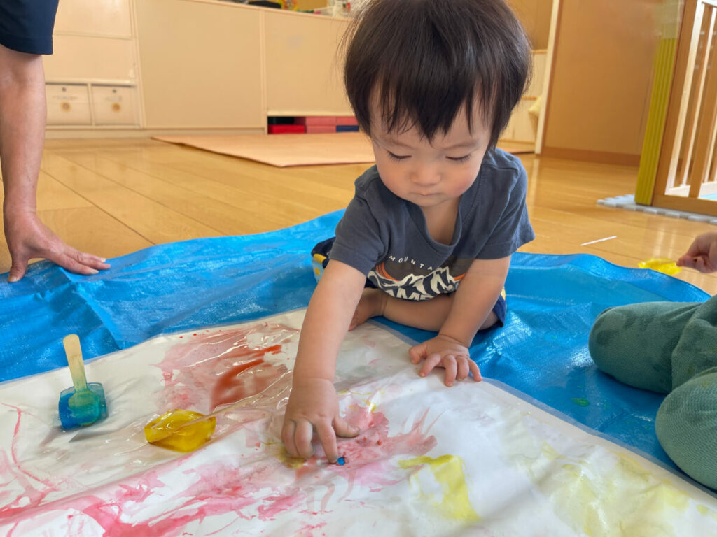 遊びの後半、氷が溶けて模造紙にできた水たまりを指でいじっていた子が、紙が破けたことに気づき、そっと保育者に渡してくれる姿もありました。