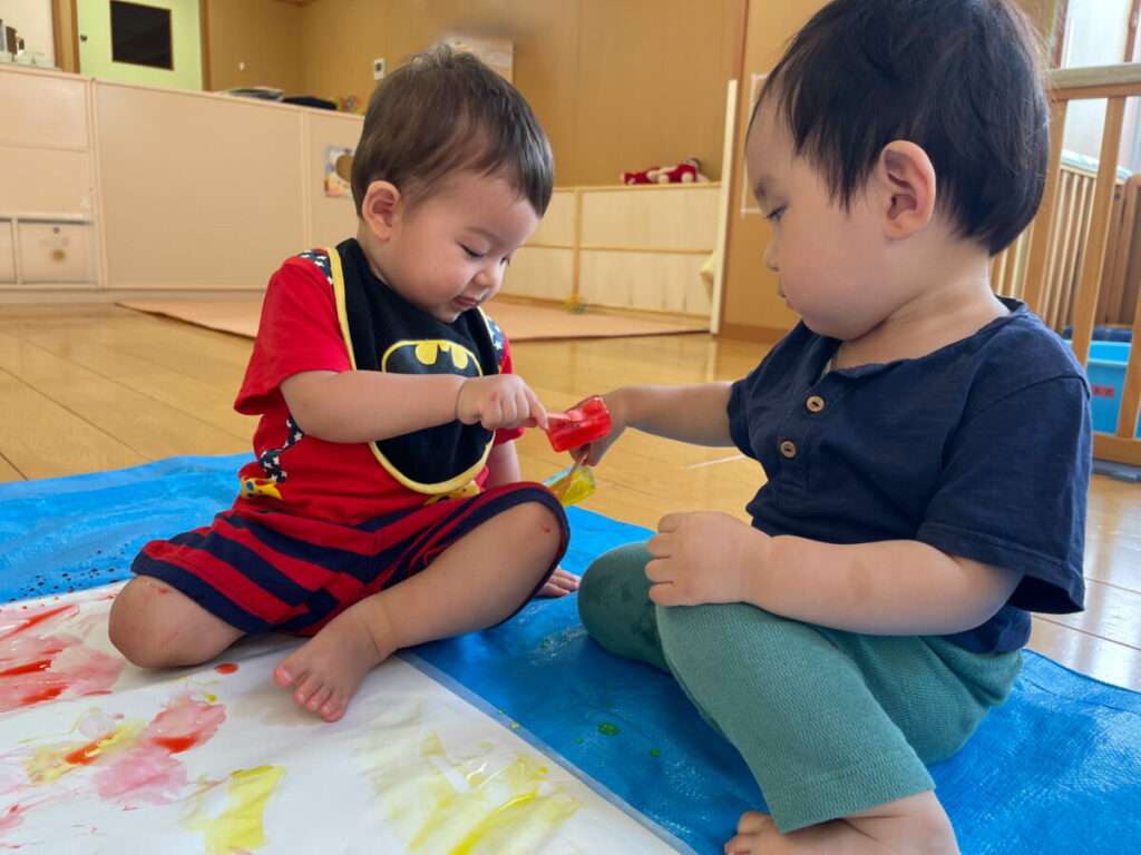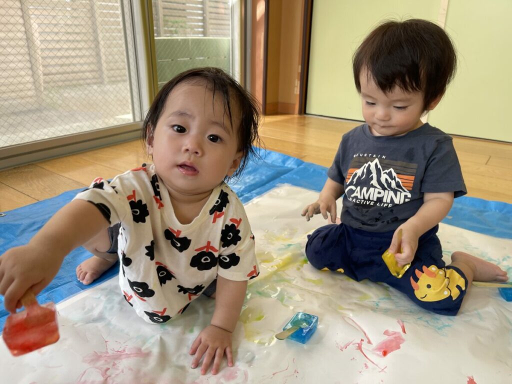 冷たさに驚いたり、氷を手や足にあてて感触を楽しんだり…。色をつけた手にそっと触れてみようとする姿も見られました。