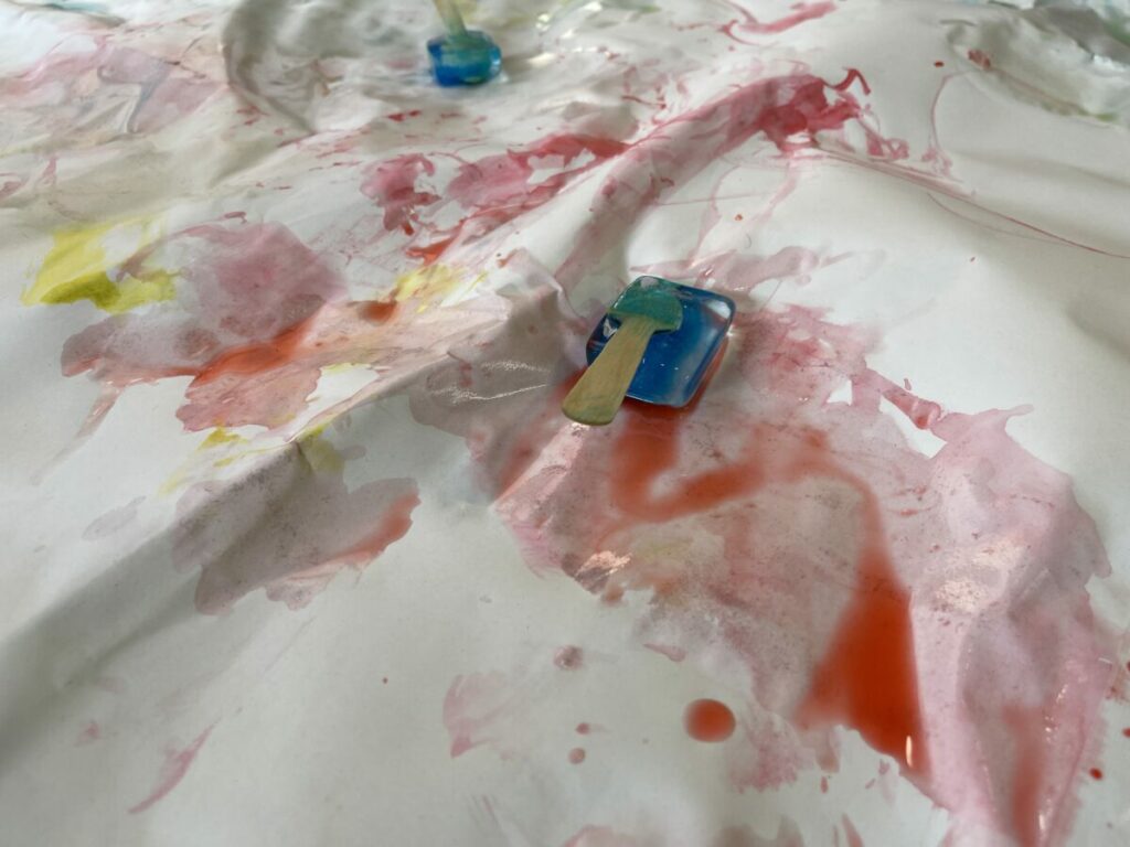 室内に模造紙を敷いて、色つきの氷遊びをしました。