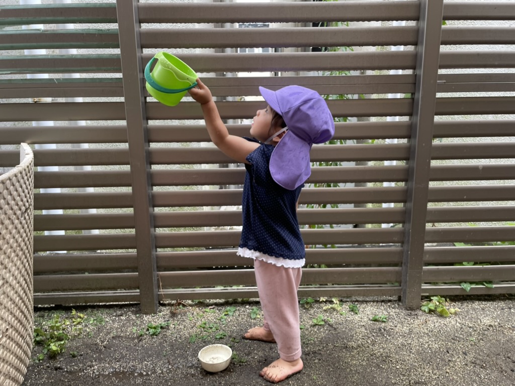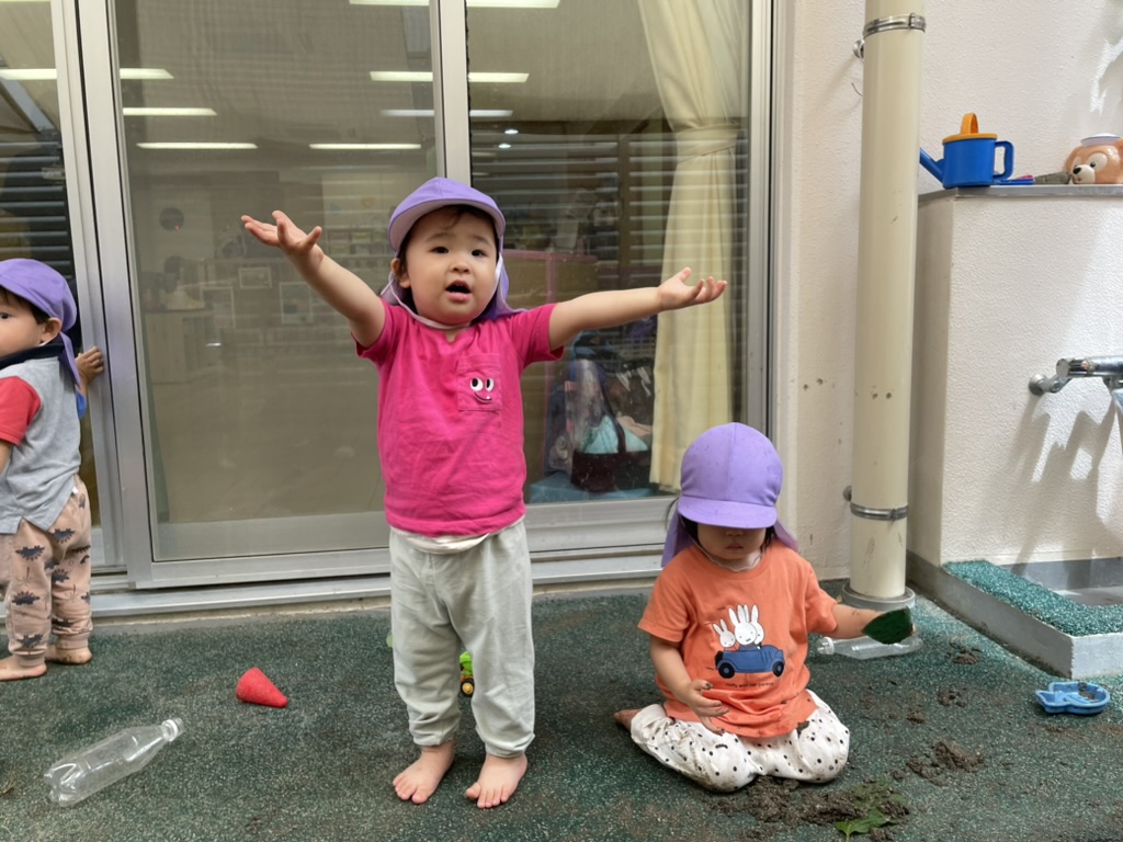 雨がやんだ後は、日除けのカーテンから雫がポタポタと落ちていたので、子どもたちと一緒に雫集めをしました。とびきり大きなバケツを選んだ子どもたちの様子から、たくさんの雨を集めたいという気持ちが伝わってきました。
