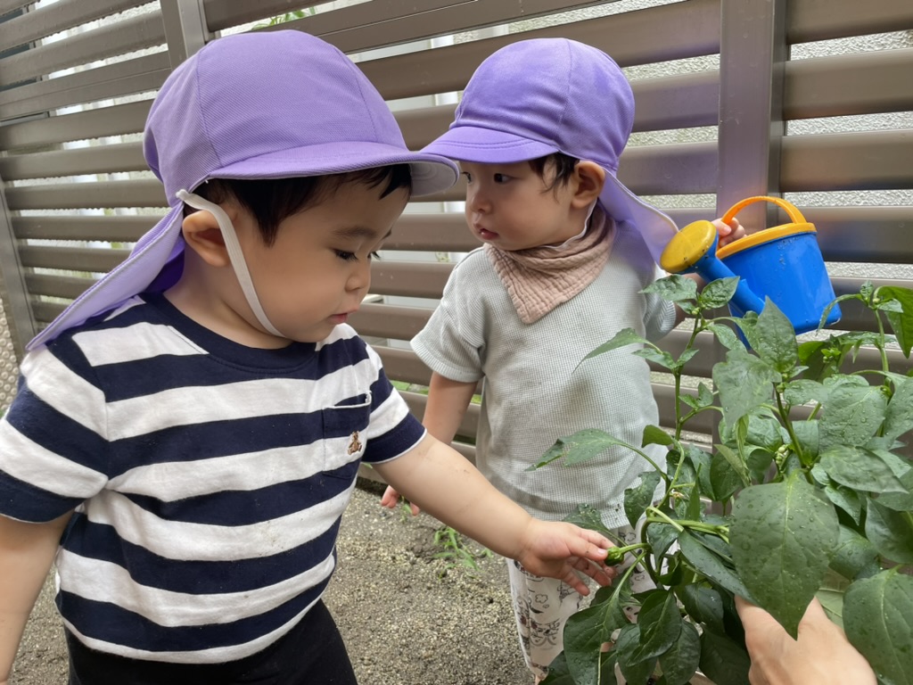 集めた雨の雫は、りす組で育てているピーマンにプレゼントしました。すると、生い茂る葉の中から小さなピーマンを発見。「なんだこれは?」と不思議そうな表情を見せながらも、興味津々に、子どもたちは指で感触を確かめていました。突然の雨が雫となり、子どもたちの目が輝く遊びへと変わったこの時間。まさに、自然が「遊びを通して学び」をもたらしてくれた瞬間でした。