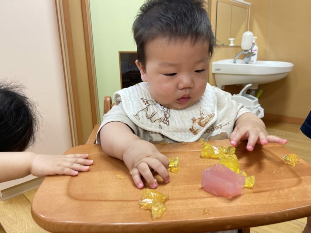 ぷるぷる・ひんやりした感触に「なんだろう?」と不思議そうに見つめたり、手で押したり握ったりして楽しんでいました。先生が「つるつる〜」「ぐちゃぐちゃ〜」と声をかけると、その声や言葉のやり取りも楽しみながら遊んでいました。